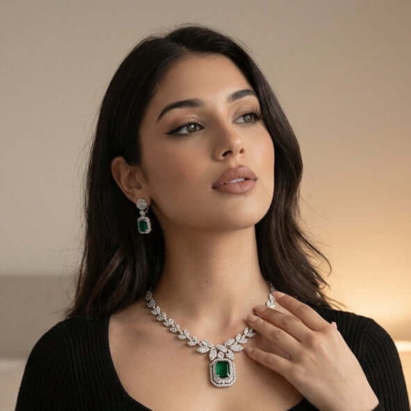 The Emerald Éclat Necklace Set is a statement of timeless luxury, featuring a radiant emerald-cut centerpiece framed by shimmering diamond-style stones. The leaf-inspired necklace design flows elegantly along the neckline, paired with refined emerald drop earrings for a perfectly balanced look.