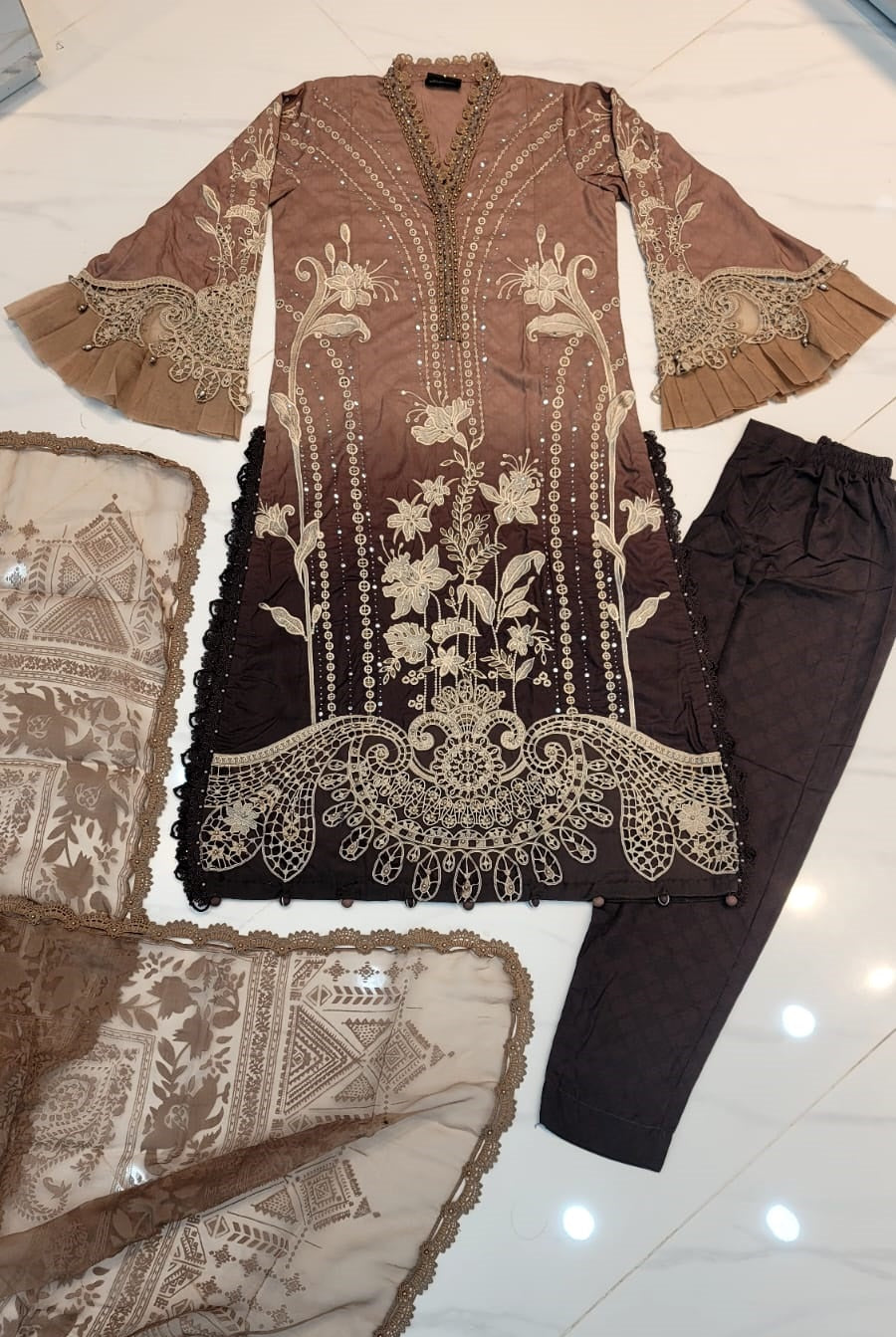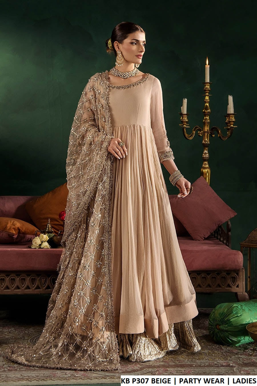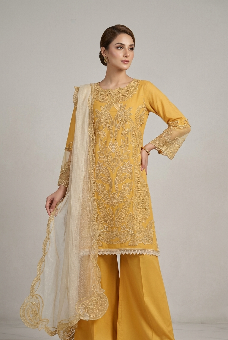 Paired with a refined dupatta for a cohesive look.