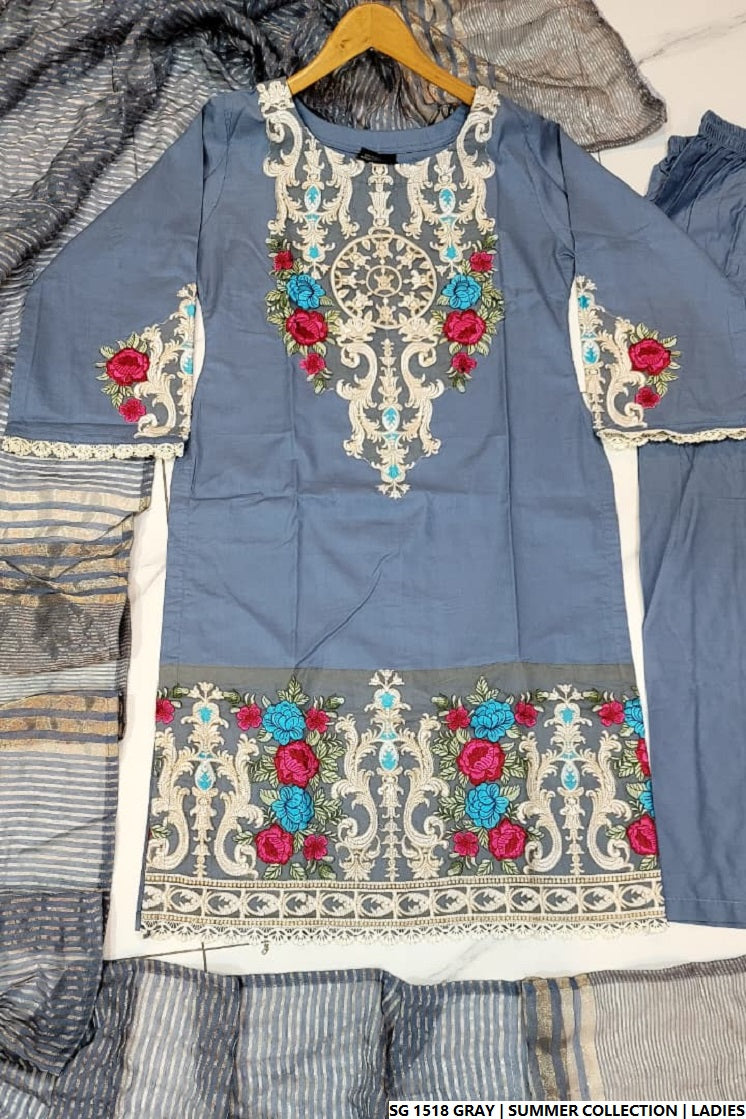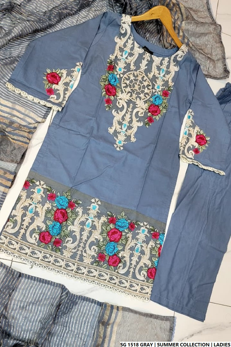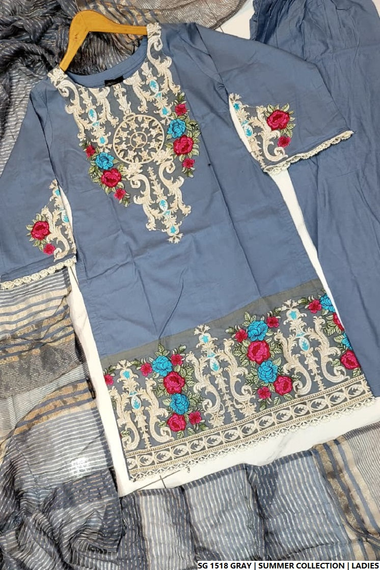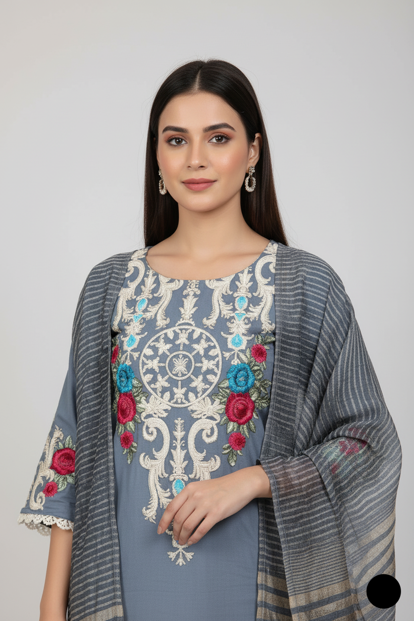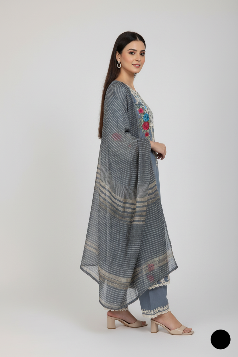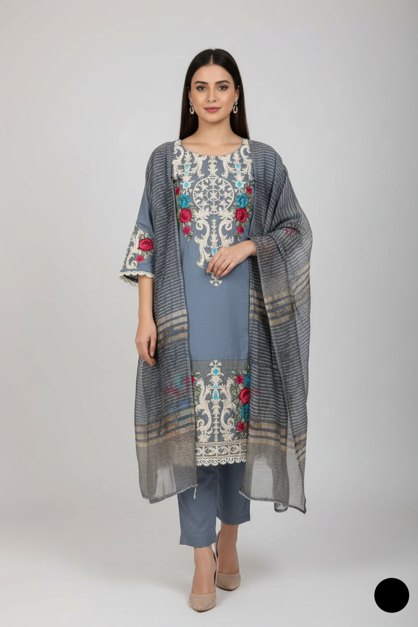 This beautifully designed 3-piece outfit features a straight-cut shirt made from breathable and durable cotton, paired with matching cotton trousers for all-day comfort. The ensemble is elevated with a luxurious Masuri dupatta, adding a subtle shimmer and grace to the overall look. With a shirt length between 41 and 43 inches, this suit offers a flattering, modest fit. Weighing only 0.550 kg, it’s perfect for everyday wear or casual gatherings.