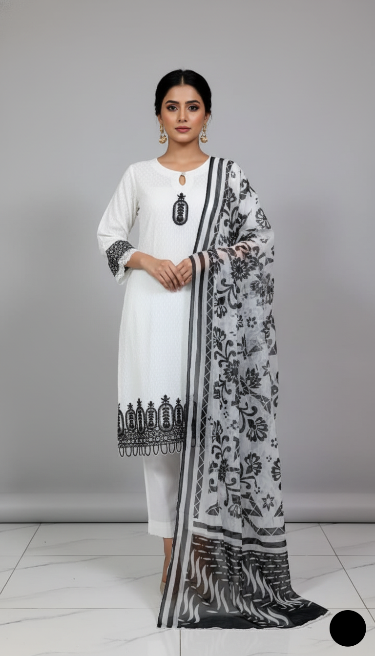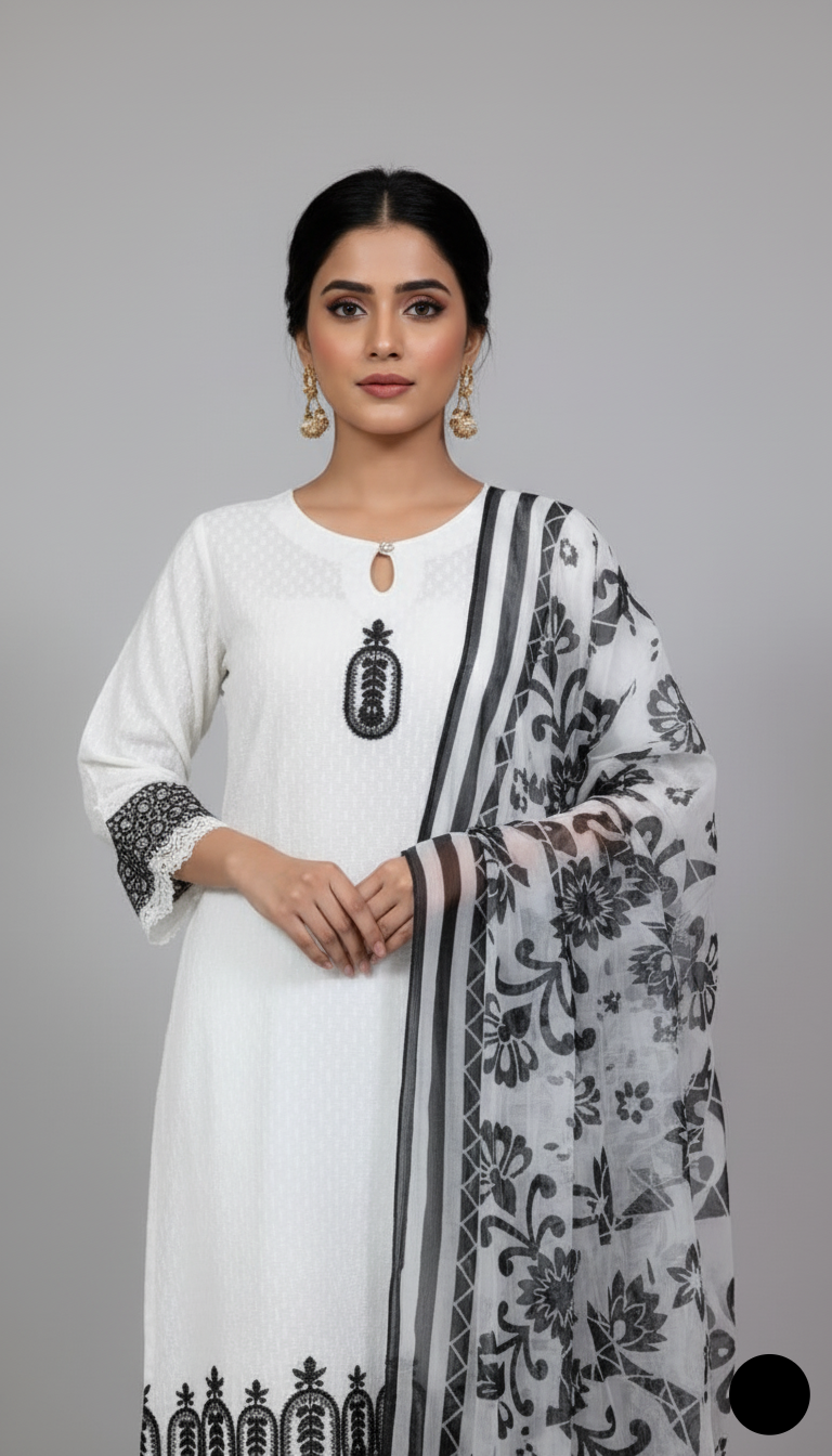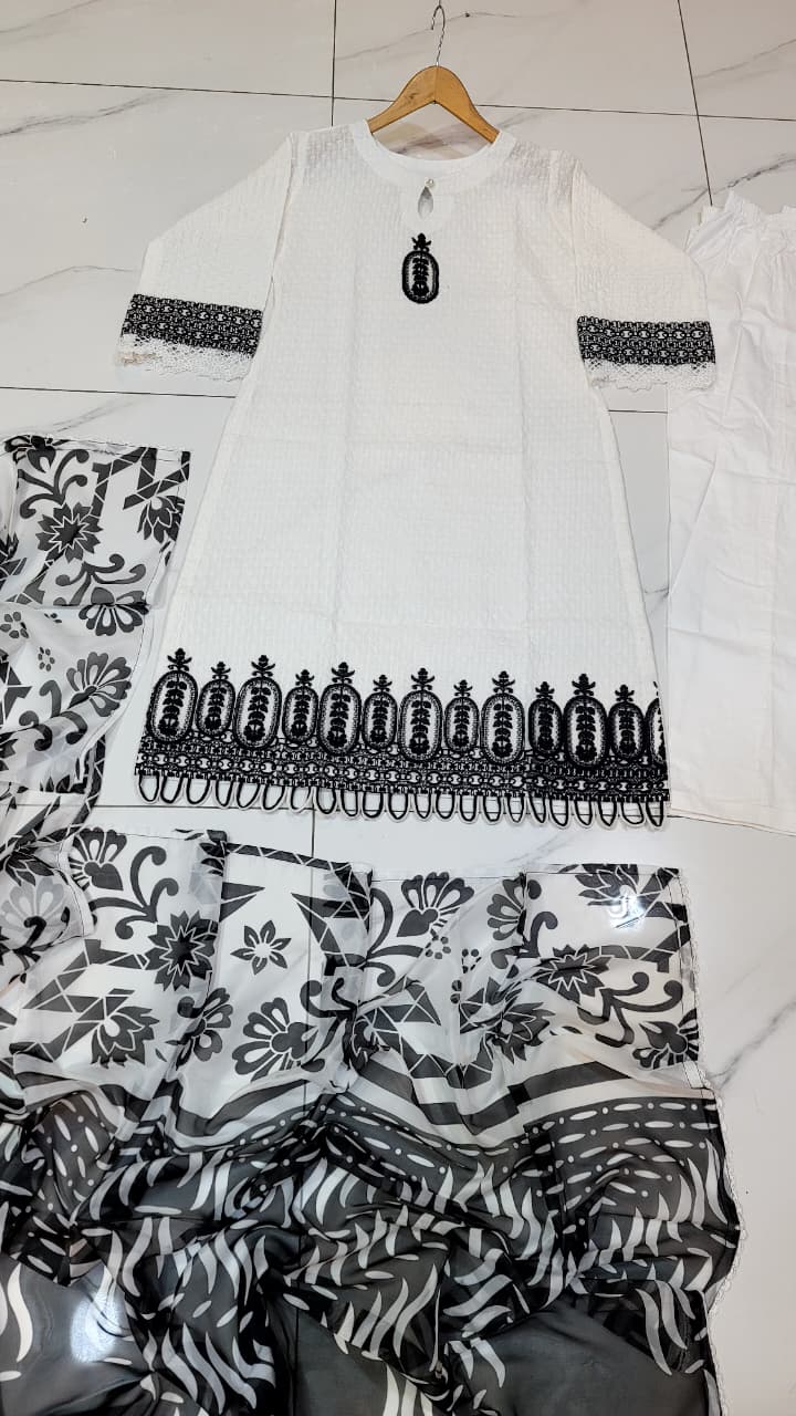 This stylish and comfortable ensemble is crafted from premium cotton fabric, ensuring breathability and ease for all-day wear. The straight shirt, available in 41/43-inch lengths, provides a sleek and elegant silhouette suitable for both casual and semi-formal occasions. The cotton trouser enhances comfort while maintaining a refined look. To complete the outfit, a digital silk dupatta adds a luxurious touch with its soft texture and vibrant digital prints, creating a perfect balance of tradition and modernity. With a total weight of 0.500 KG, this outfit is lightweight, elegant, and ideal for warmer seasons.
