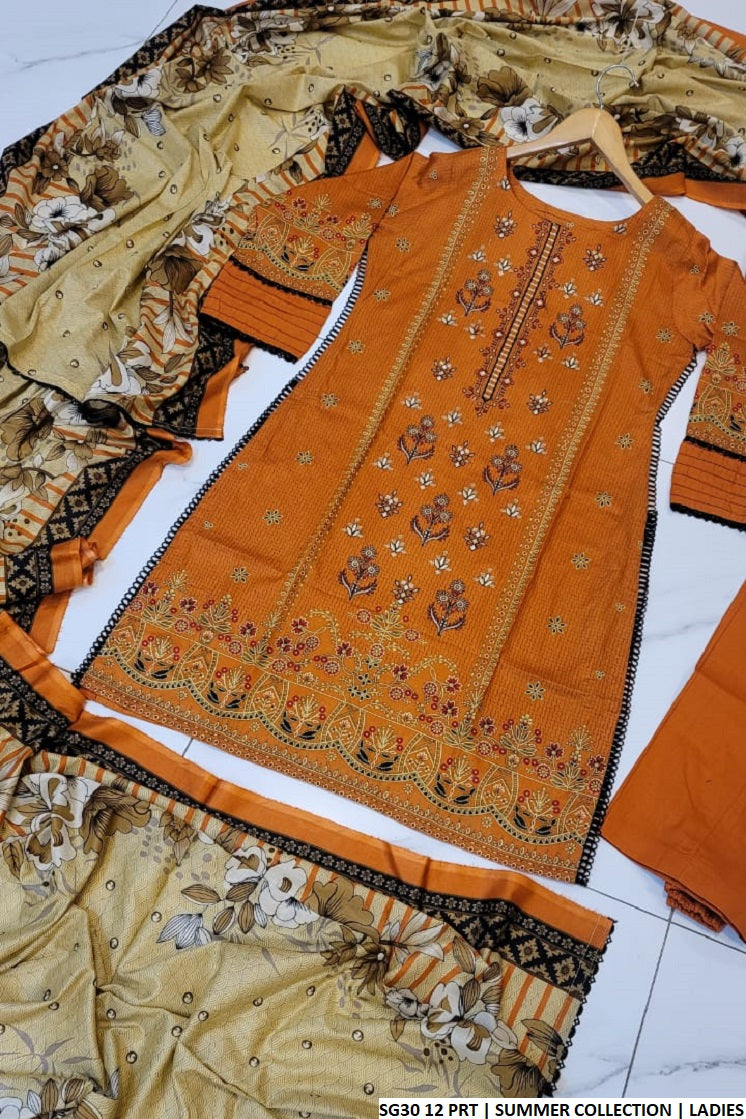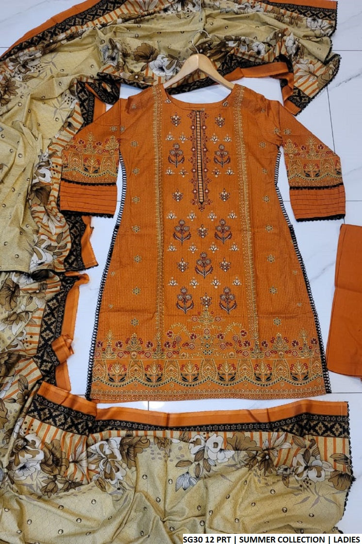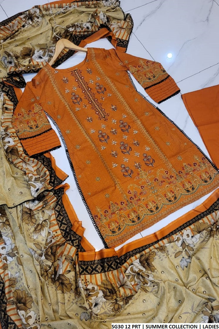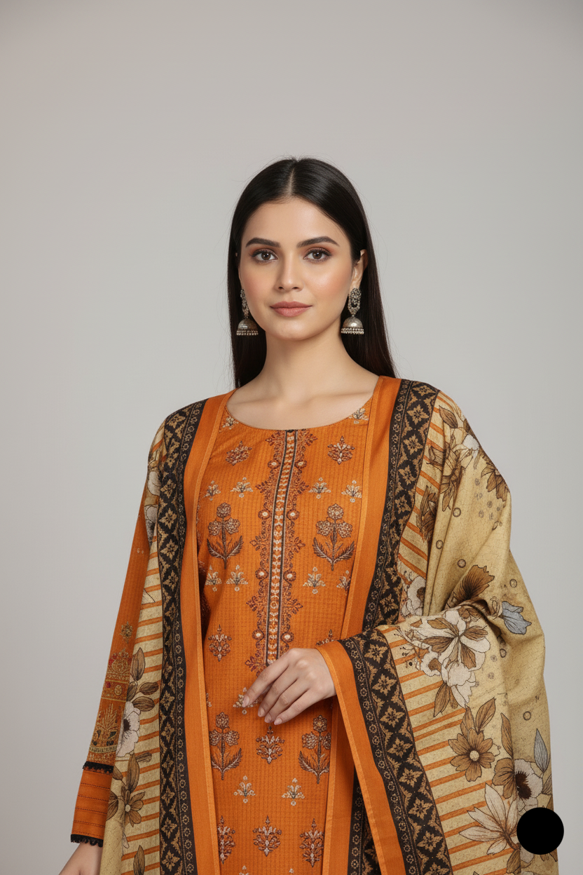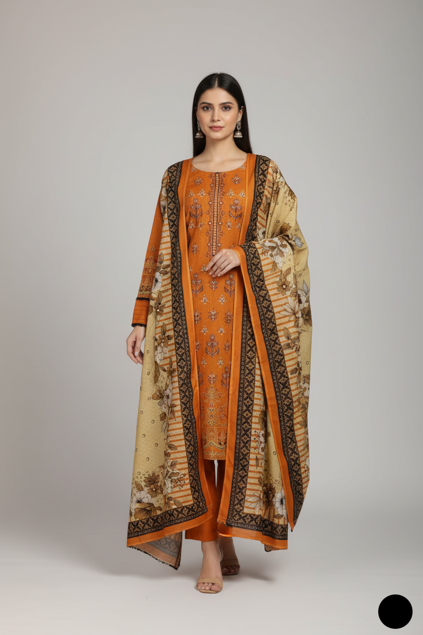 This elegant 3-piece lawn suit features a flattering A-line shirt design that offers both style and comfort. The shirt, with a length of 38 to 40 inches, is crafted from lightweight, breathable lawn fabric, making it ideal for warm weather. The set includes matching lawn trousers and a coordinated lawn dupatta, completing the look with understated grace. Weighing 0.500 kg, it’s a comfortable and easy-to-wear outfit suitable for casual gatherings, daytime outings, or everyday wear.