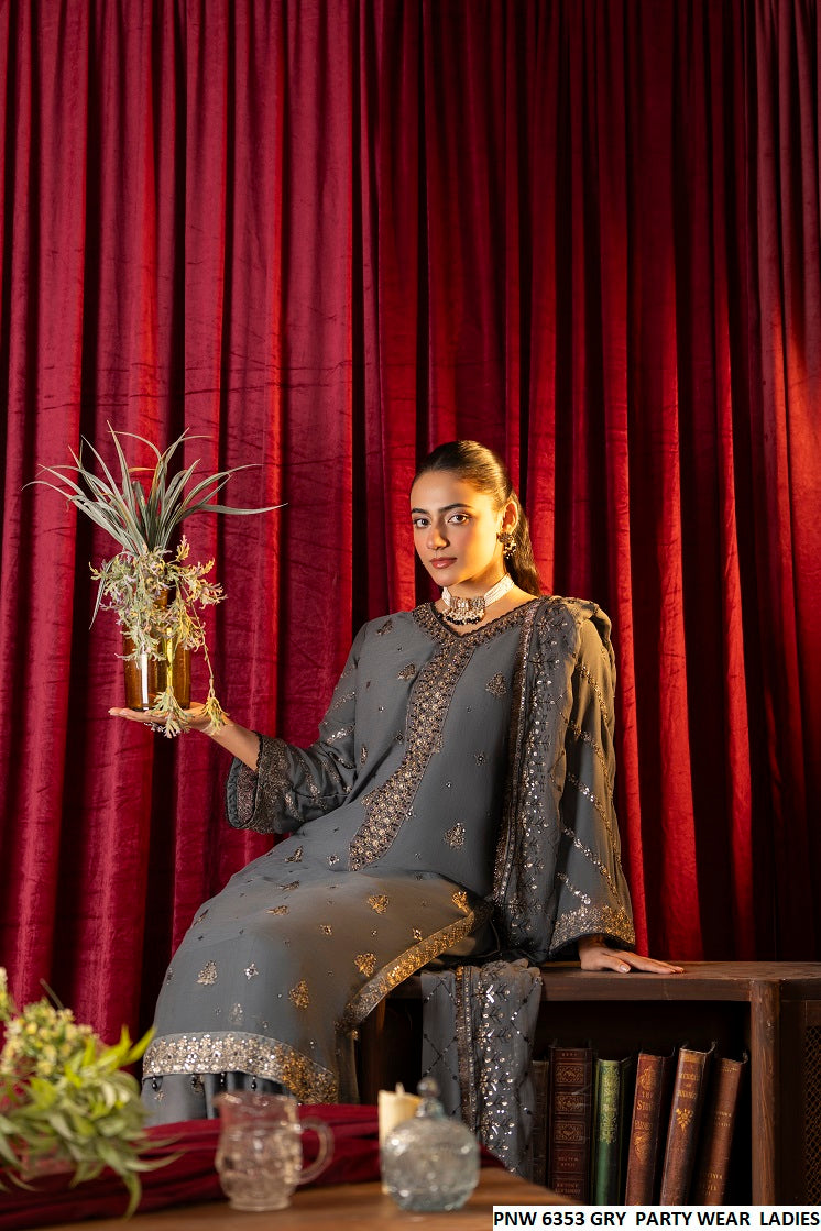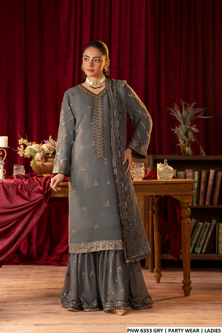 1. This elegant outfit features a chiffon shirt (38/40 inches) paired with a matching chiffon gharara and dupatta. Weighing 0.850 kg, it offers a lightweight yet sophisticated look, perfect for special occasions.