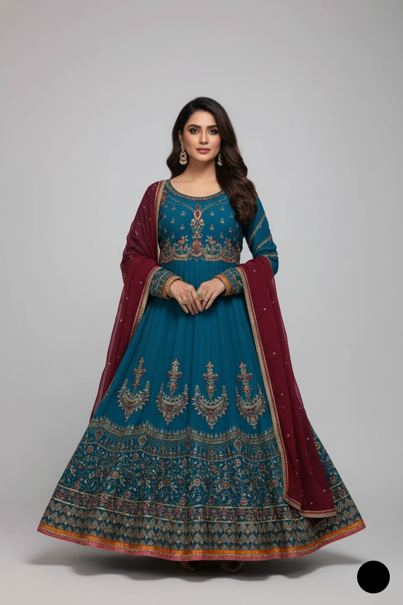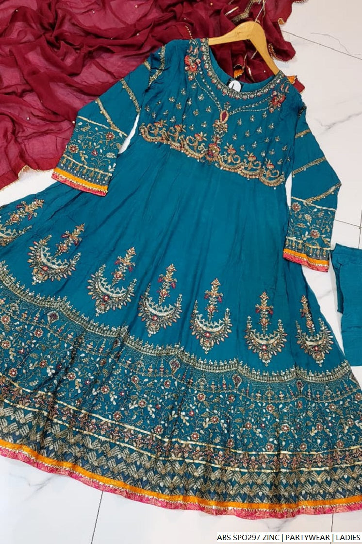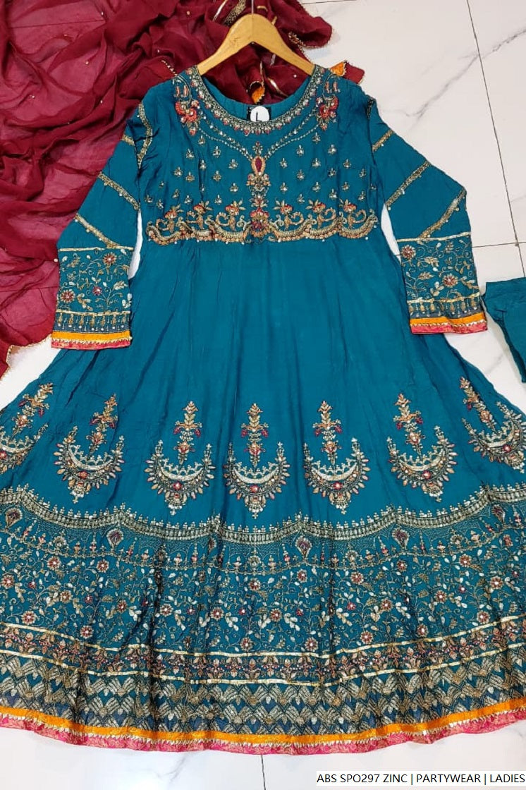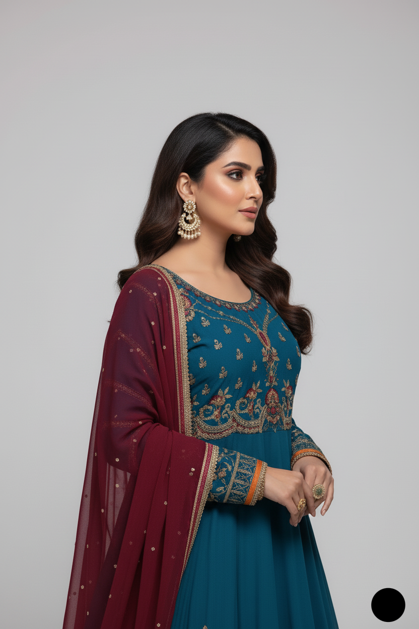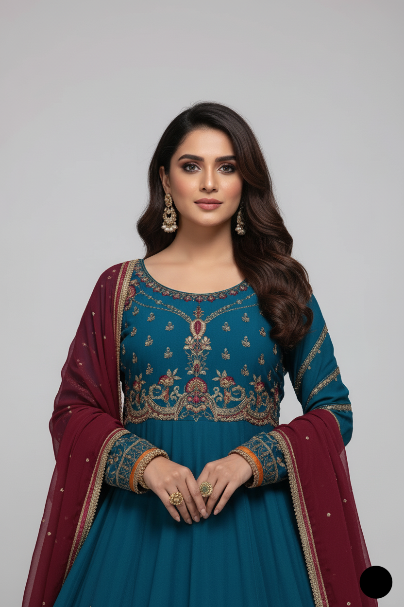 This graceful 3-piece ensemble is designed for elegance and comfort. The outfit features a flowy chiffon shirt in a stylish long frock design, offering a flattering silhouette for any formal or semi-formal occasion. It is paired with soft and comfortable grip trousers and a matching chiffon dupatta, completing the look with charm and sophistication. With a shirt length of 48 to 50 inches and a total weight of 1.250 kg, this outfit is both lightweight and elegant — ideal for making a lasting impression.