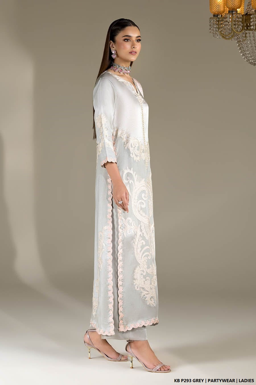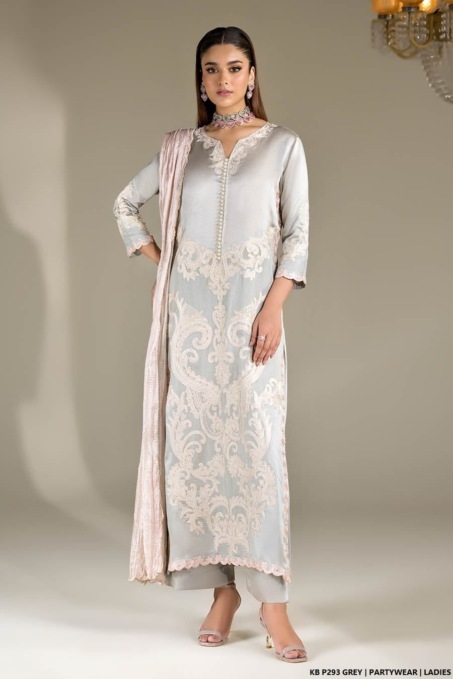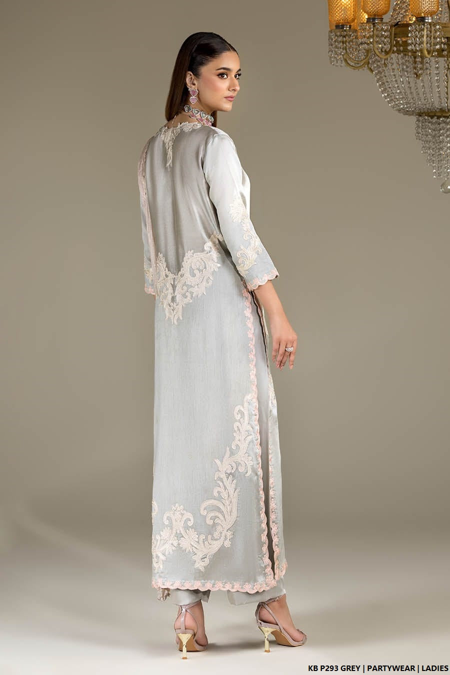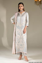 This stunning long shirt ensemble is beautifully crafted using a combination of premium fabrics. The shirt features gloss silk on the top and lower sections, embellished with delicate thread and dori work, while the middle portion is designed with rich raw silk for added texture and elegance. The set includes charmeuse silk trousers that deliver a smooth and luxurious feel. Completing the outfit is a double-layer silk dupatta that enhances the overall sophistication. With a shirt length of 47/49 and a lightweight feel of just 0.750 kg, this outfit is perfect for formal occasions, offering both comfort and style.