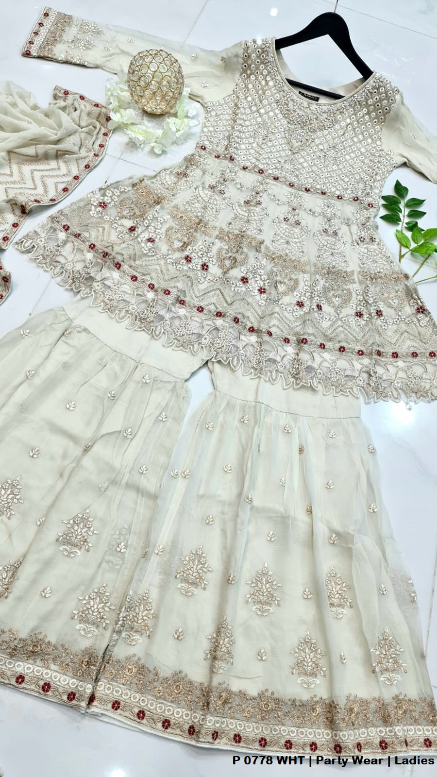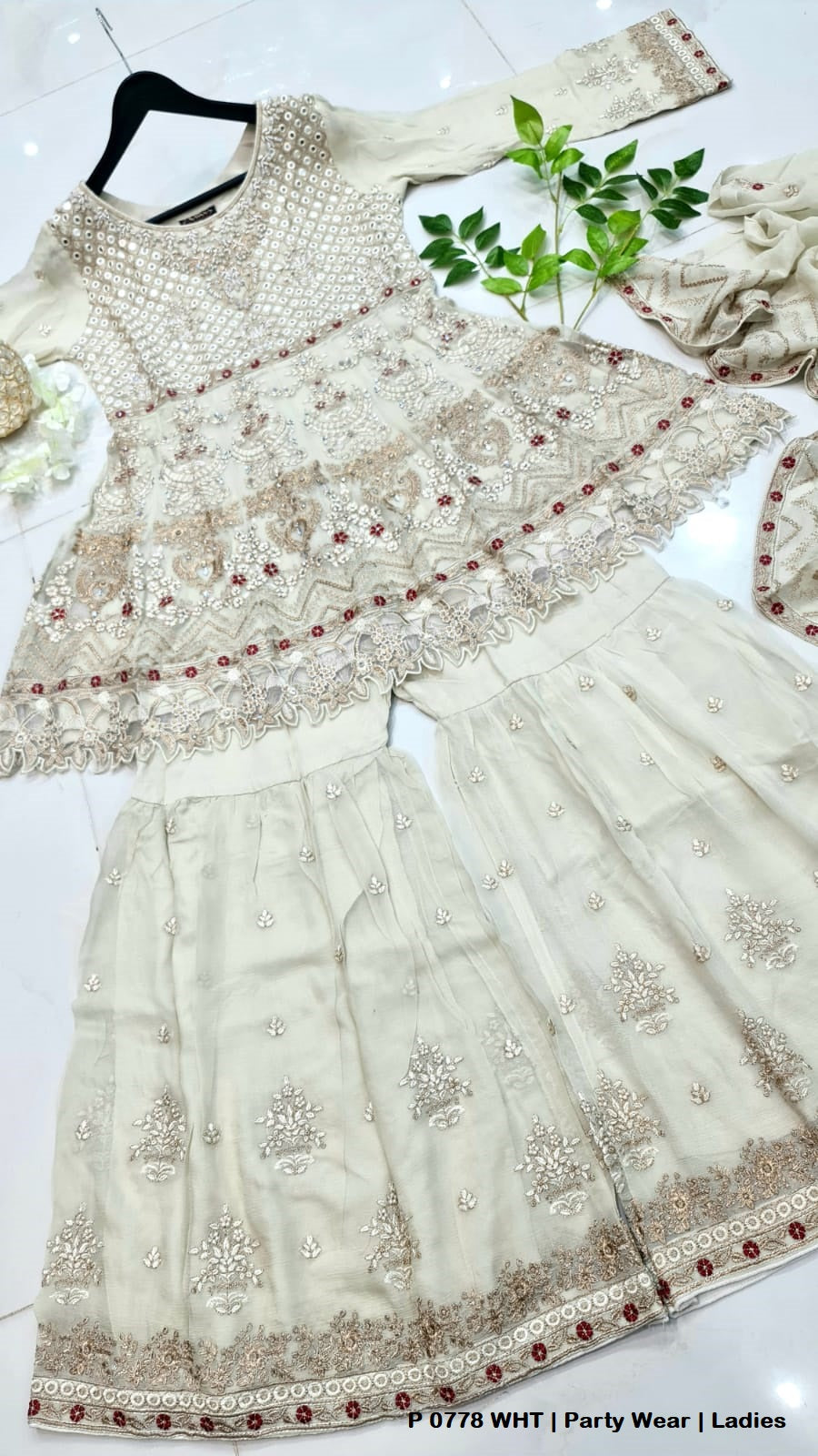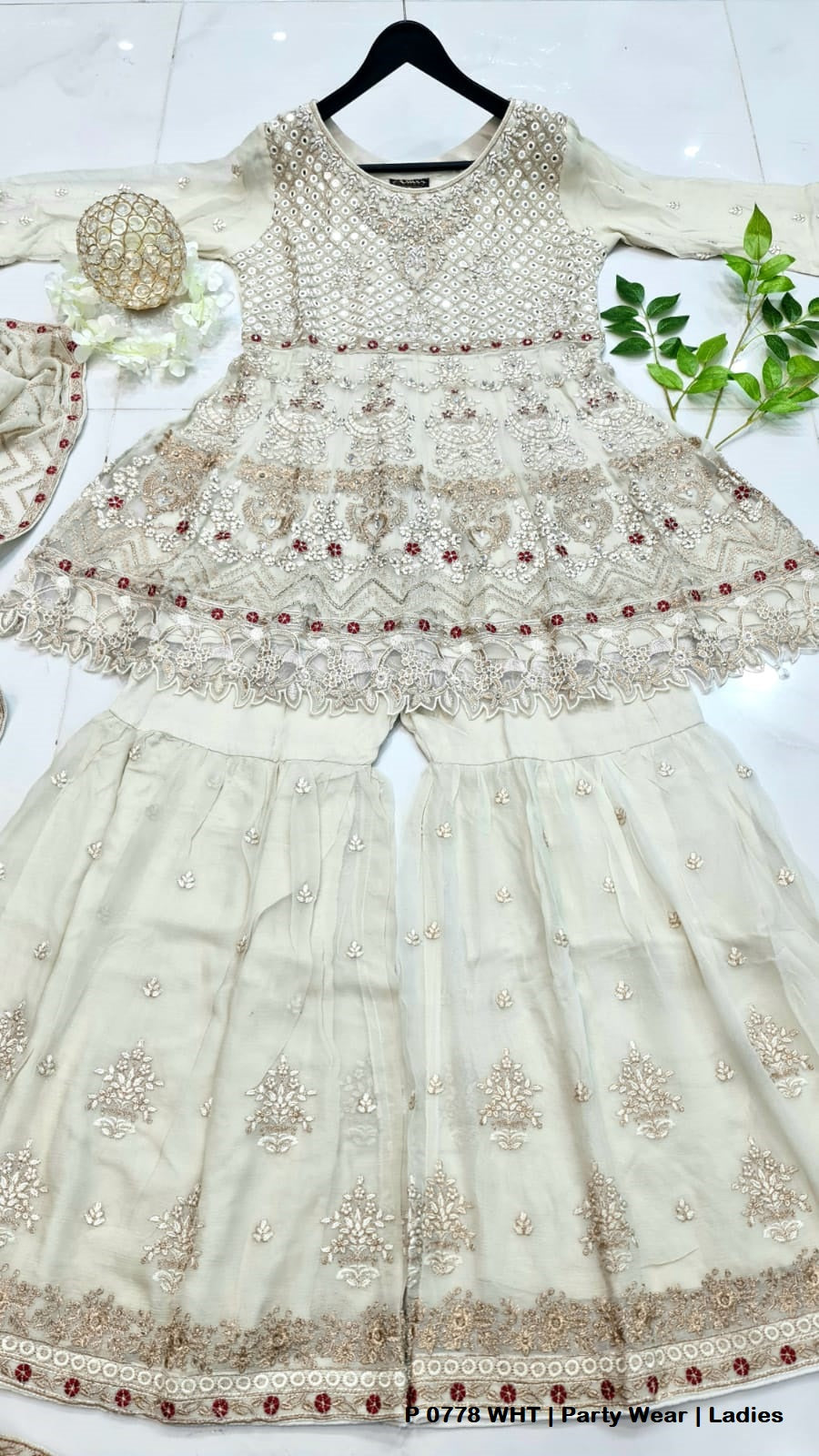 - This beautiful outfit features a short frock with a gharara, both crafted from lightweight chiffon fabric, which adds a soft and flowing texture. The shirt length is 33/35 inches, offering a stylish and flattering cut that pairs well with the traditional gharara trousers. The dupatta is also made from chiffon, complementing the overall elegance of the ensemble. Weighing 0.950 kg, this attire is comfortable yet luxurious, perfect for formal gatherings or festive occasions. The chiffon fabric gives the outfit an airy, graceful look, making it a versatile and sophisticated choice.