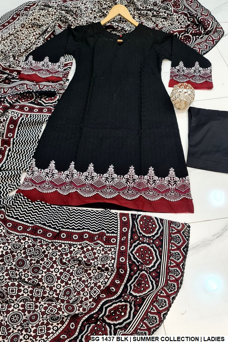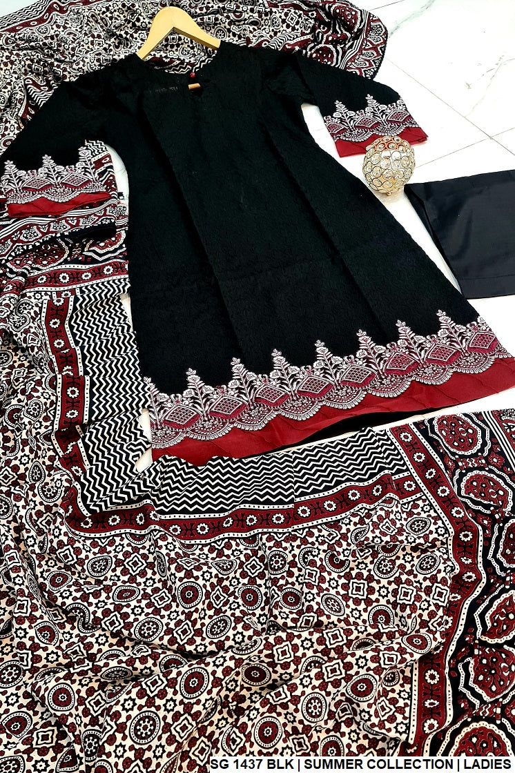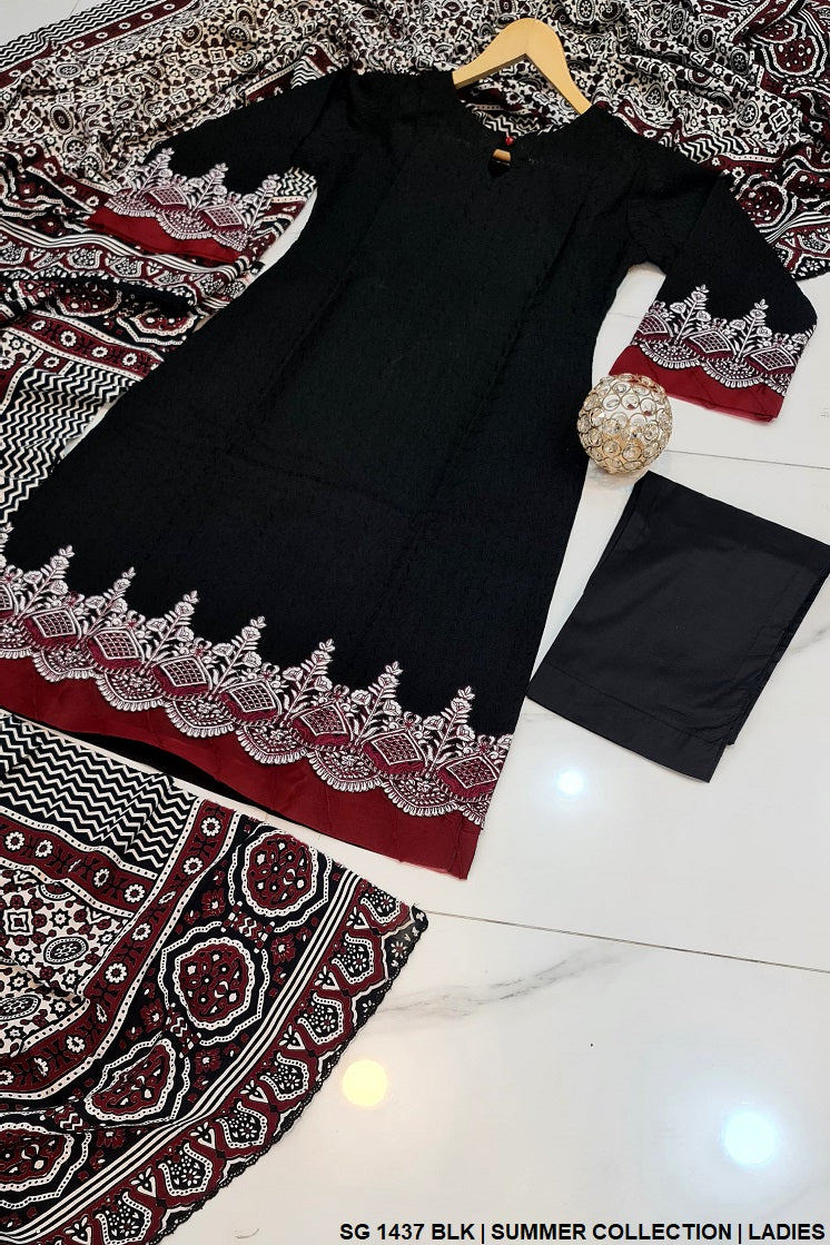This chic outfit features a straight shirt crafted from soft, breathable cotton fabric, ensuring comfort and ease throughout the day. Available in lengths of 41 or 43 inches, the shirt provides a sleek and modern fit that is perfect for various occasions. Paired with matching cotton trousers, this ensemble offers a coordinated and stylish appearance. The look is elevated with a beautiful Ajrak shawl, which adds a traditional touch with intricate patterns and a rich color palette. Weighing just 0.700 kg, this lightweight outfit is ideal for both casual and semi-formal occasions, offering a perfect balance of elegance, comfort, and timeless style.