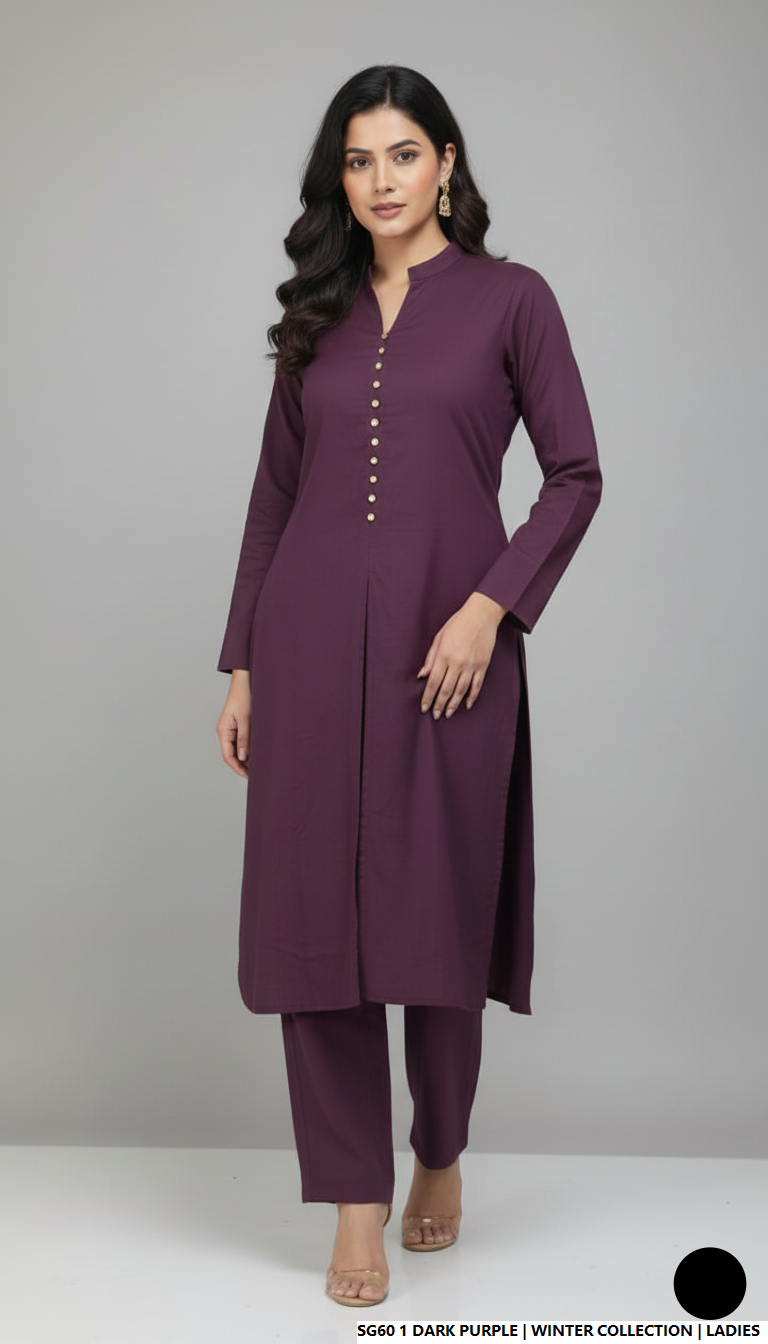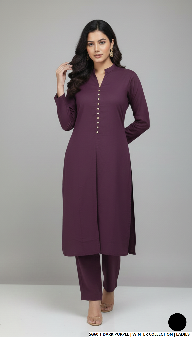This stylish outfit is crafted from soft and warm Marina fabric, offering comfort and durability for cooler weather. The design features a chic goal daman shirt with a 40/42-inch length, paired with matching Marina trousers for a perfectly coordinated look. With a total weight of 0.600 kg, this ensemble provides a cozy feel while maintaining a refined and elegant appearance.