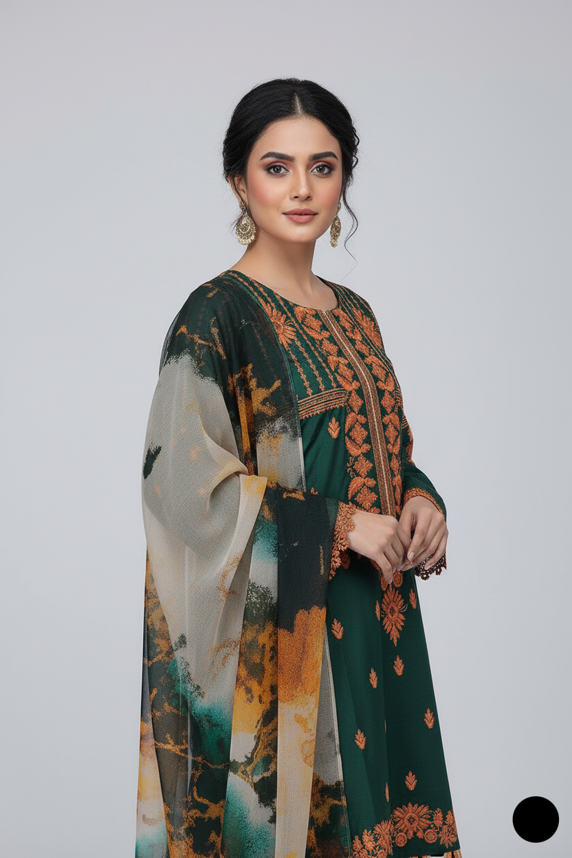 This elegant ensemble features a straight shirt crafted from breathable cotton, paired with a traditional farshi shalwar also made from soft cotton for all-day comfort. The digital printed dupatta adds a vibrant touch to the overall look. With a shirt length of 35/37 inches, this outfit strikes a perfect balance between classic style and modern grace. Weighing only 0.500KG, it's lightweight and easy to wear for any occasion.
