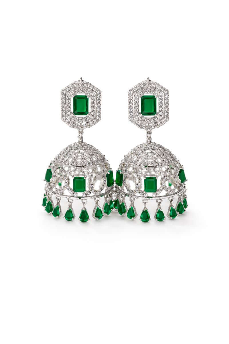An elegant pair of silver-tone jhumkas adorned with radiant emerald-green stones and fine crystal detailing. Designed to catch light from every angle, these statement earrings bring a regal charm to festive, bridal, and formal looks. Lightweight yet striking, perfect for weddings, parties, and special occasions.