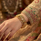 Embrace timeless bridal elegance with JW207, a majestic gold-tone bangle crafted with intricate kundan-inspired detailing and geometric motifs. Accented with delicate crystal highlights and subtle green stone touches, this piece reflects traditional craftsmanship with a royal finish.