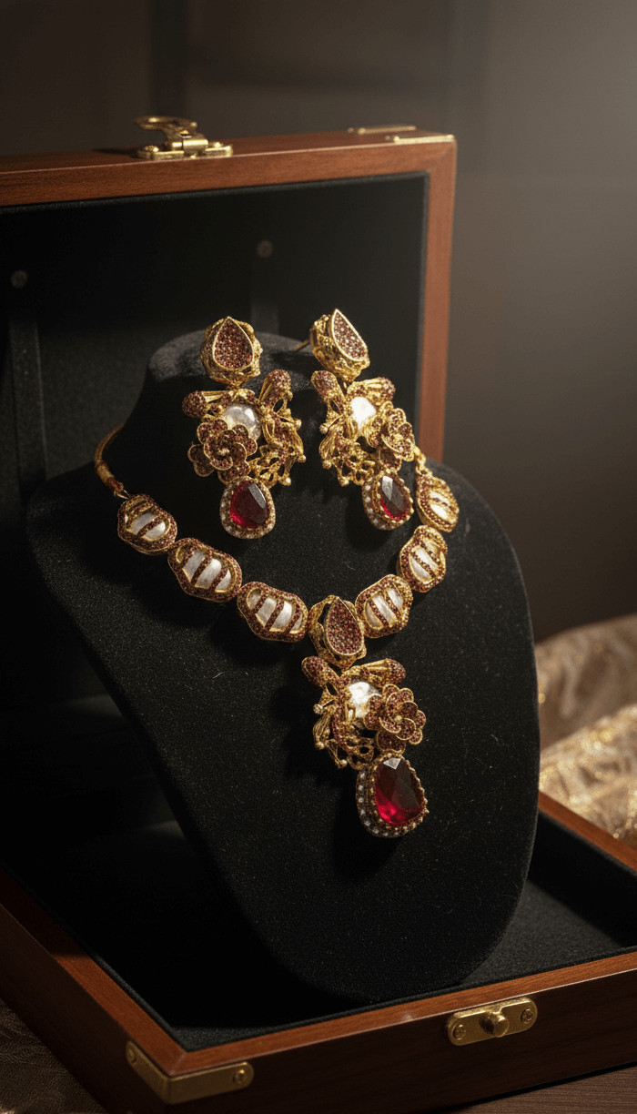 The JW352 Ruby Heritage Necklace Set showcases timeless Pakistani elegance through intricate gold craftsmanship, deep ruby-toned stones, and classic pearl accents. Designed for those who appreciate traditional luxury, this set delivers a regal presence suitable for weddings, festive gatherings, and formal occasions.