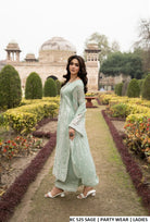This sophisticated outfit features a georgette long straight shirt adorned with matte thread embroidery and elegant lace detailing on the chalks, giving it a refined and festive look. It is paired with capri-style plazo trousers enhanced with an embroidered patch for a contemporary yet traditional appeal. The chiffon dupatta, finished with all-around embroidery, completes the ensemble, making it ideal for festive gatherings, parties, and cultural events.
