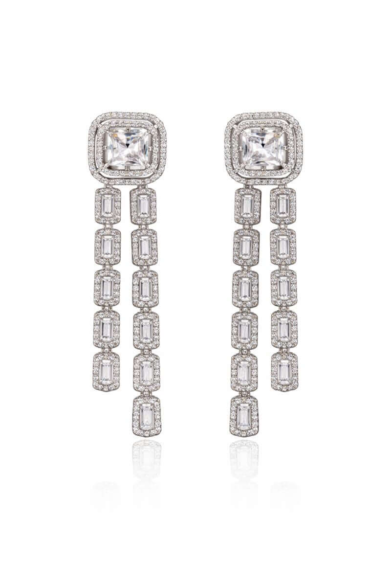 Add instant elegance to your look with these Diamond Luxe Cascade Earrings. Featuring a striking square-cut centerpiece framed by shimmering stones, the design flows into sleek, elongated drops that create a graceful and luxurious silhouette. Perfect for weddings, formal evenings, and statement styling, these earrings bring refined sparkle and modern sophistication to any outfit.