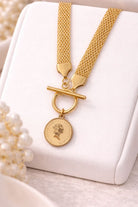 The Golden Coin Mesh Chain is a statement piece that blends modern elegance with classic charm. Designed with a finely woven gold-tone stainless steel mesh chain, it features a stylish toggle clasp finished with a detailed coin pendant for a bold yet refined look.