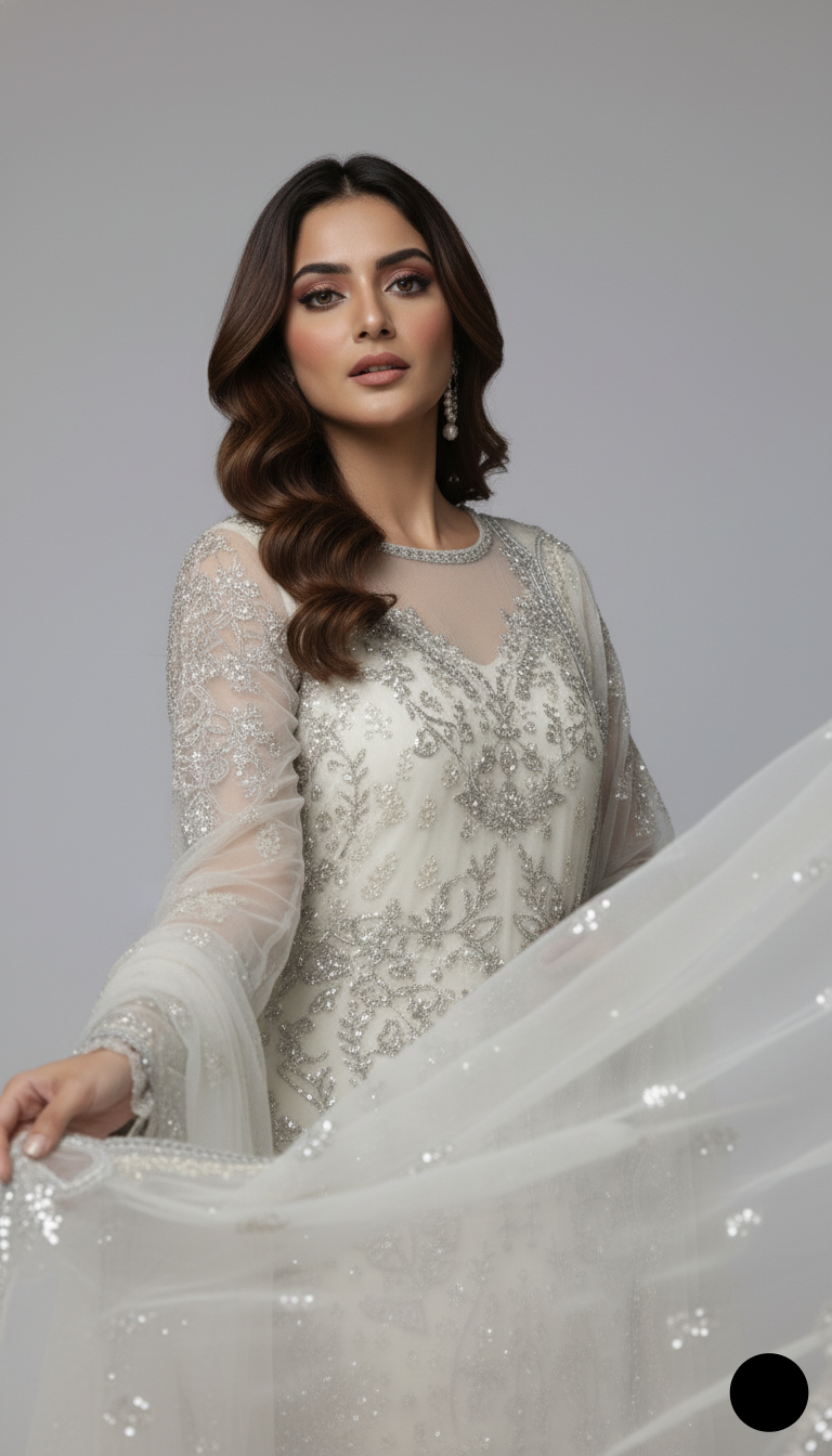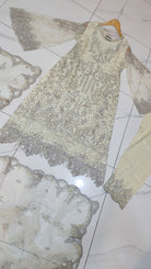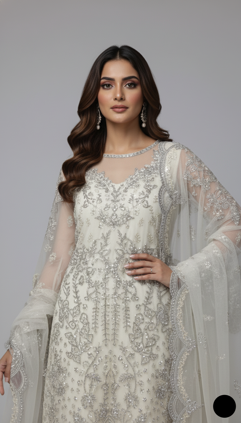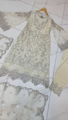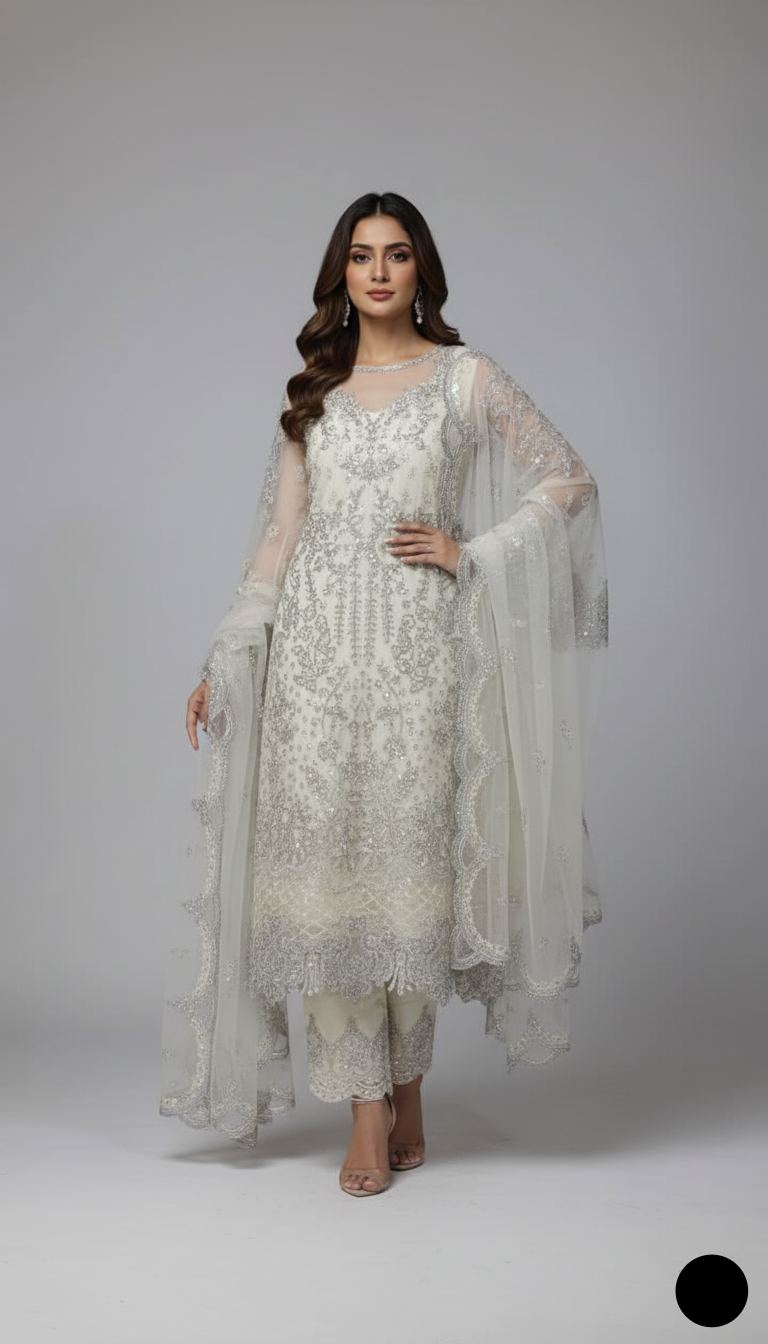 This refined 3-piece suit features a straight shirt made from lightweight net fabric, offering a delicate and graceful look with a length of 46 to 48 inches. The ensemble is completed with comfortable grip trousers that provide structure and ease of movement, while the matching net dupatta adds an airy, elegant finish. Weighing just 0.950 kg, this outfit is perfect for those seeking style with subtle sophistication—ideal for festive events, formal gatherings, or evening occasions.