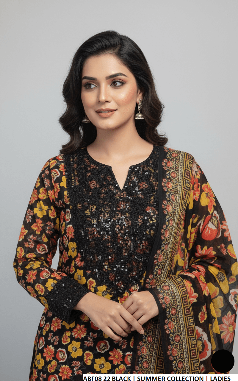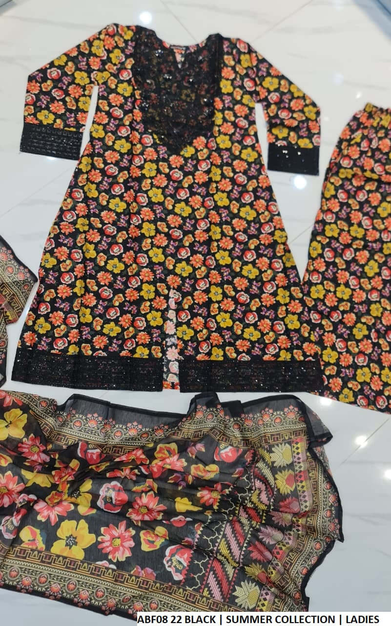 This beautiful long frock outfit is crafted from soft and breathable lawn fabric, paired with matching lawn plazo trousers for a comfortable and stylish fit. The digital print dupatta adds a vibrant and contemporary touch, enhancing the overall appeal. With a shirt length of 44 to 46 inches and a lightweight 0.500 kg, this ensemble is perfect for casual gatherings, festive occasions, or summer wear.