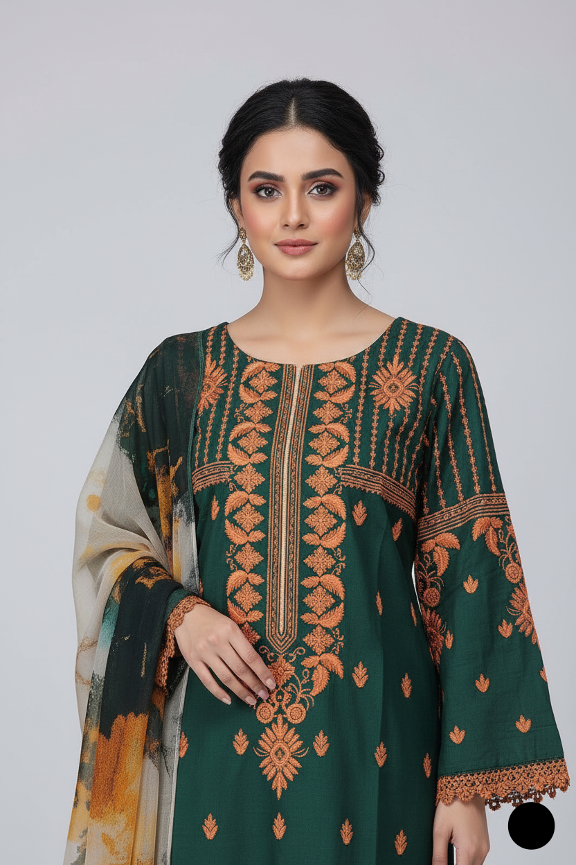 This elegant ensemble features a straight shirt crafted from breathable cotton, paired with a traditional farshi shalwar also made from soft cotton for all-day comfort. The digital printed dupatta adds a vibrant touch to the overall look. With a shirt length of 35/37 inches, this outfit strikes a perfect balance between classic style and modern grace. Weighing only 0.500KG, it's lightweight and easy to wear for any occasion.