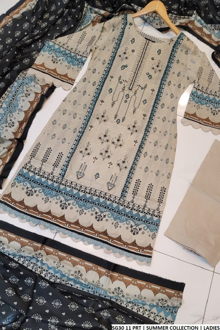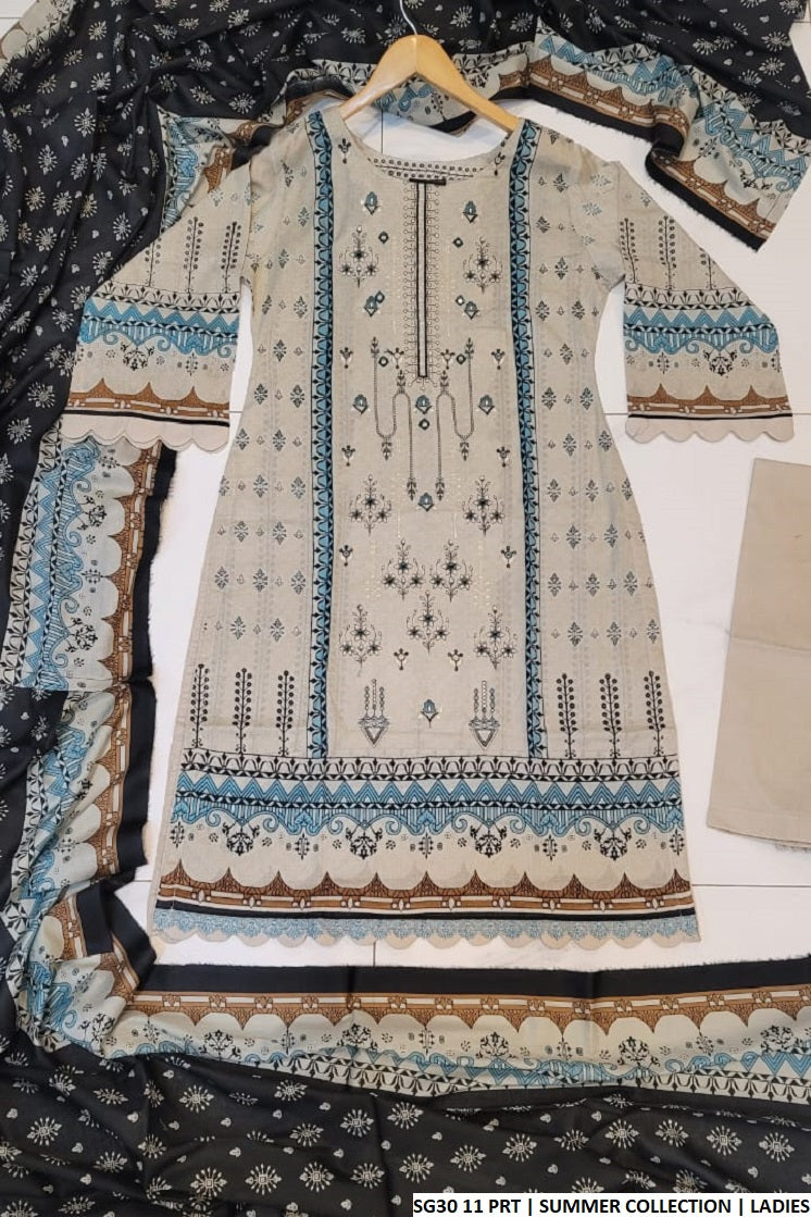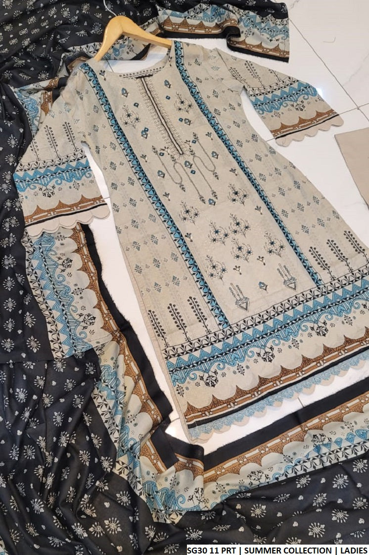 This chic 3-piece lawn suit features a flowy A-line shirt that offers a perfect blend of elegance and comfort. The shirt, measuring 41 to 43 inches in length, is tailored from breathable lawn fabric, making it ideal for daily wear, especially during warmer seasons. Paired with coordinating lawn trousers and a matching lawn dupatta, this outfit is designed for effortless style. With a total weight of just 0.450 kg, it’s a lightweight yet stylish choice for casual gatherings and everyday use.