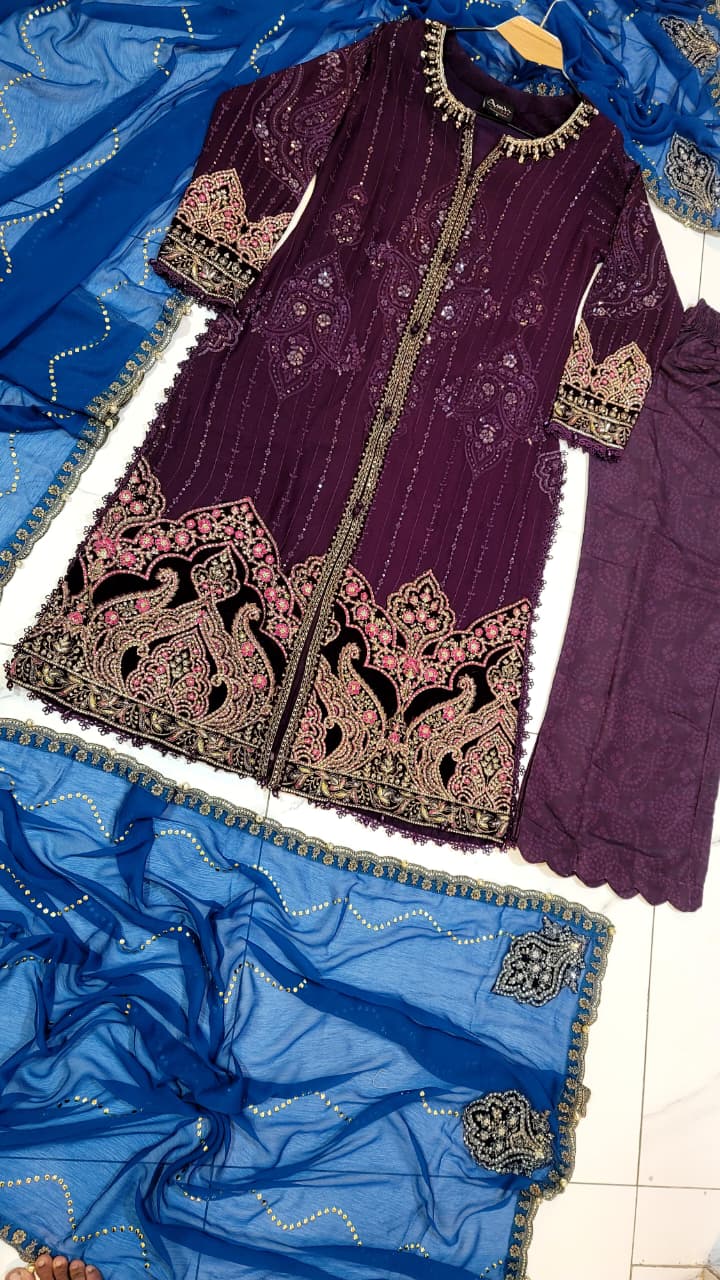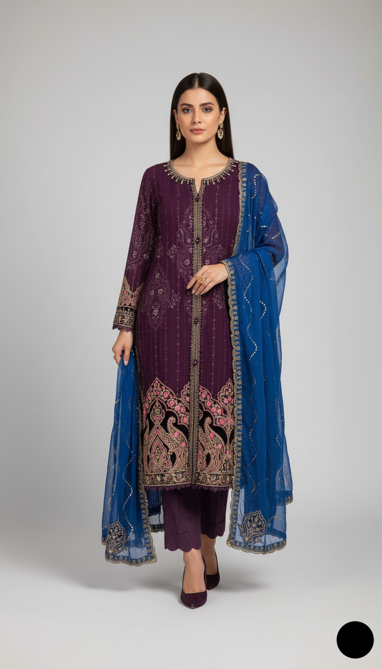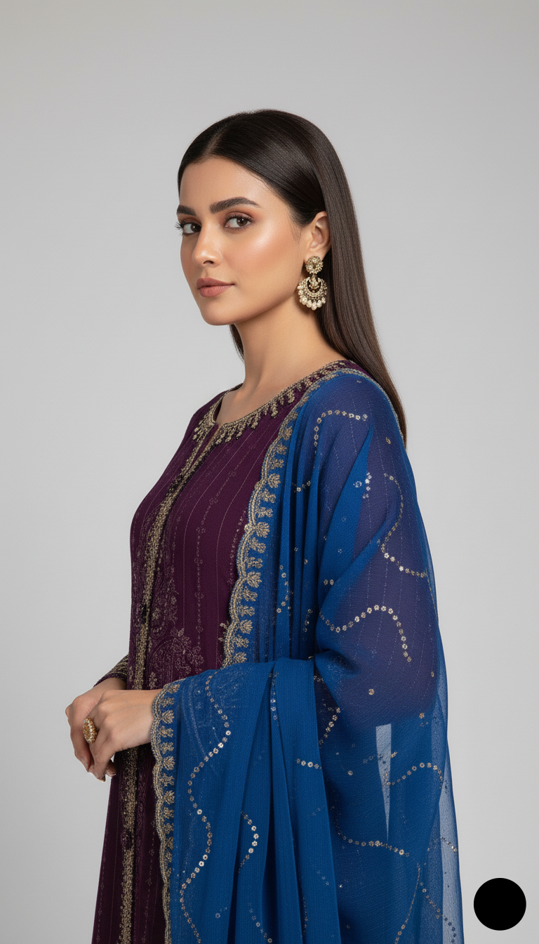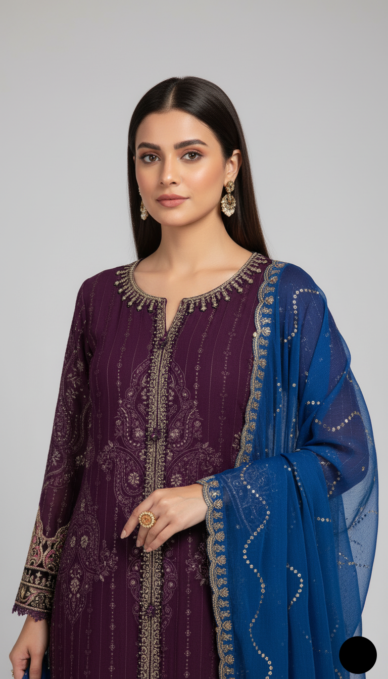 This elegant ensemble features a graceful open A-line shirt crafted from premium chiffon, offering a flowy and sophisticated silhouette. The shirt is paired with a comfortable grip fabric trouser, ensuring a flattering fit. Completing the look is a matching chiffon dupatta that adds an extra touch of elegance. With a shirt length of 45 to 47 inches and a lightweight design of only 1.050 kg, this outfit is perfect for formal gatherings and festive occasions.