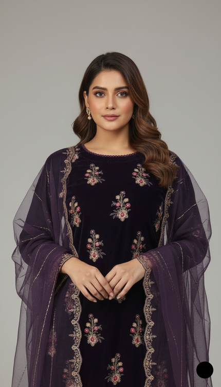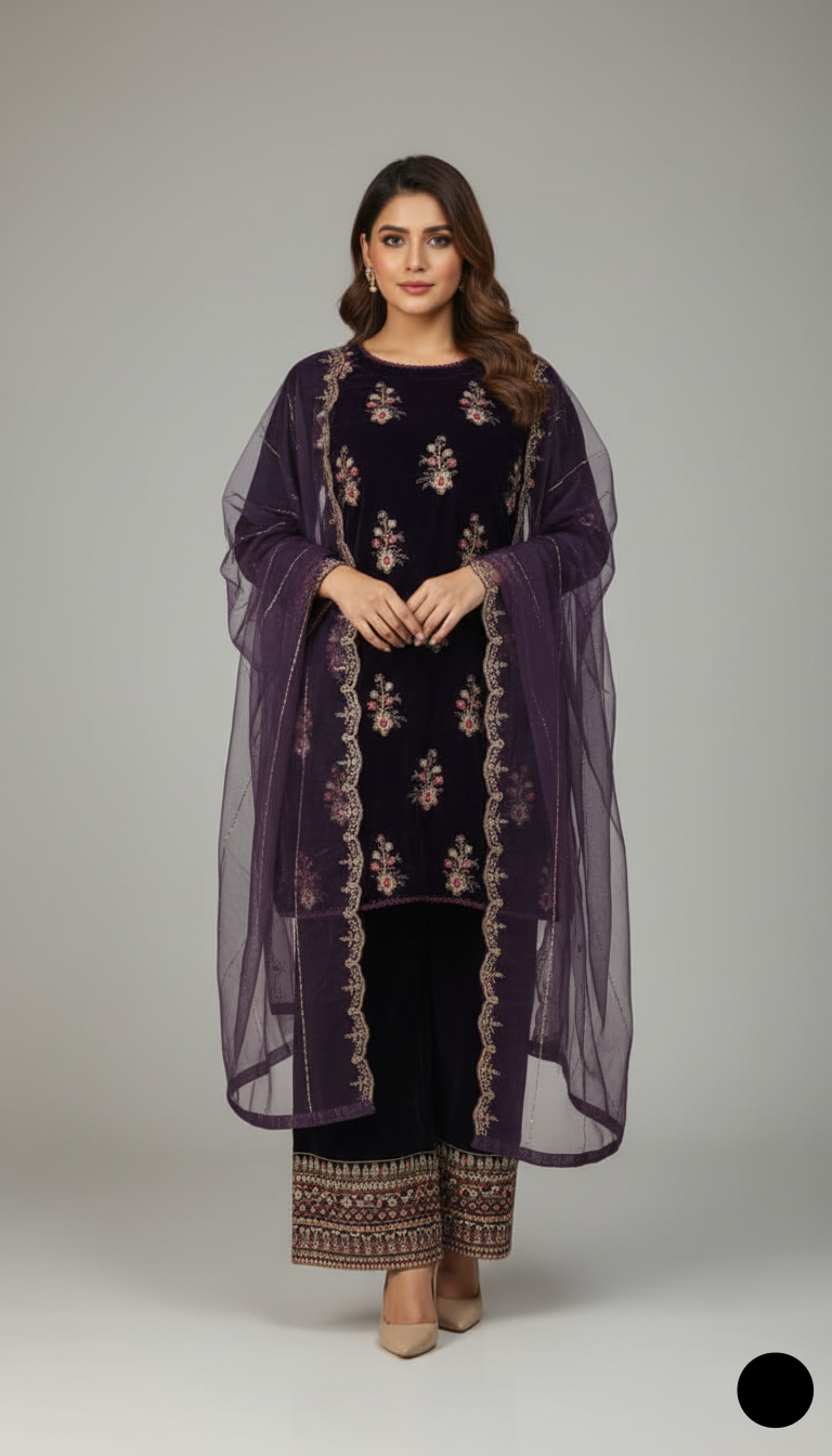 This graceful ensemble features a velvet shirt styled with a contemporary plazo trouser, creating an elegant and modern silhouette. The outfit is perfectly complemented by a sheer organza dupatta, adding softness and sophistication to the overall look. With a shirt length of 38/40 inches and a total weight of just 0.750 kg, this outfit offers a lightweight yet rich feel — ideal for festive events, formal gatherings, or evening functions.