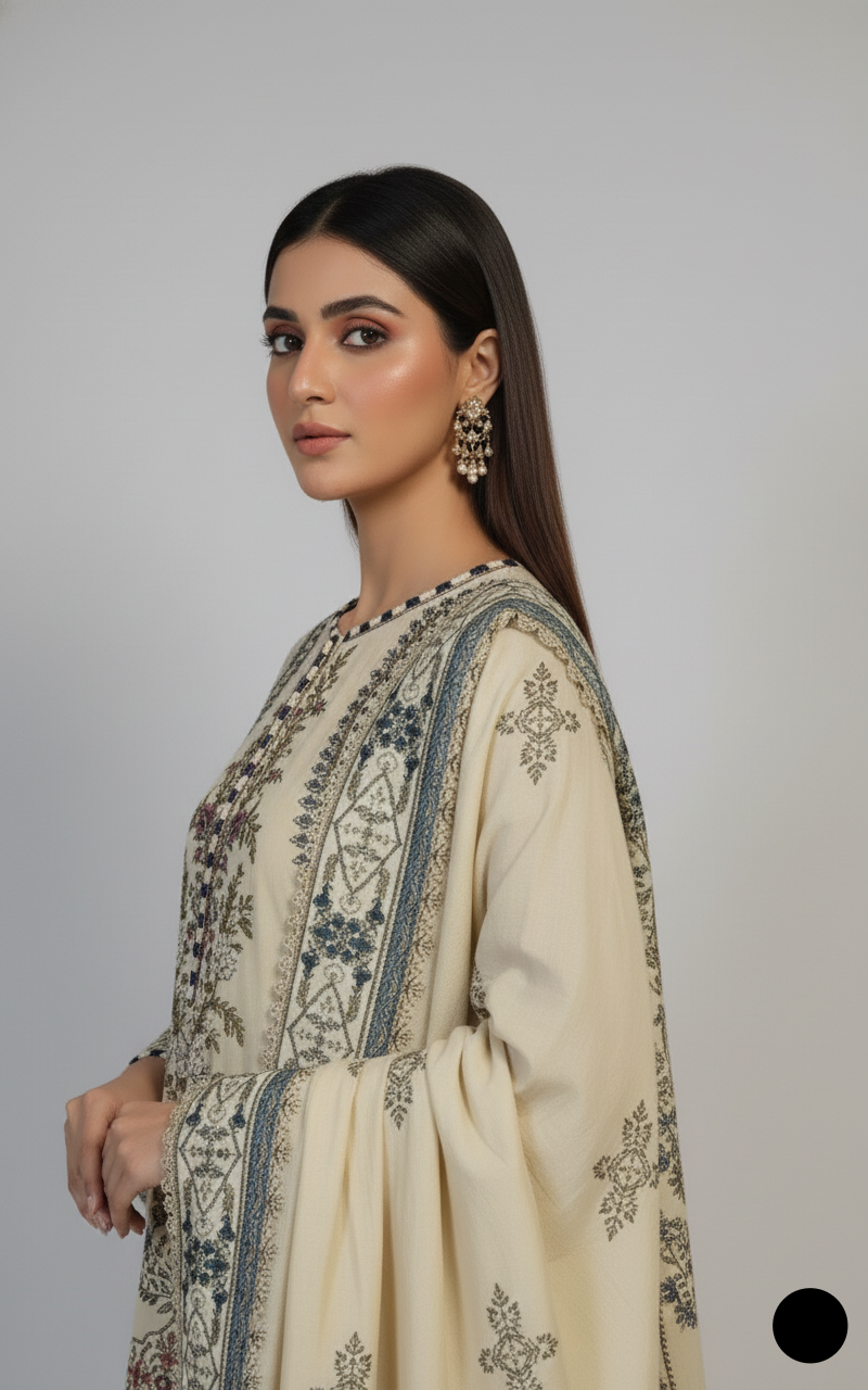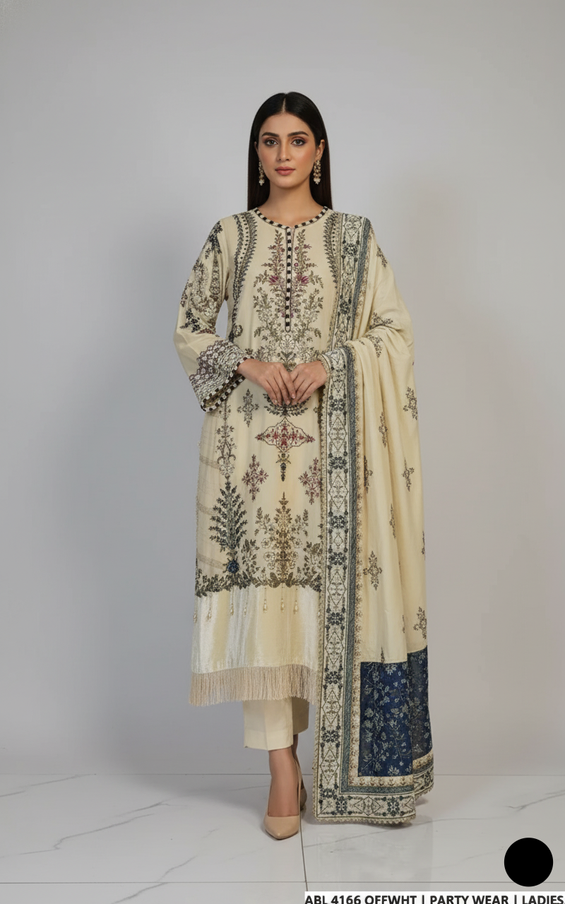This elegant set features a chic A-line chiffon shirt (48 inches in length), paired with well-structured grip-fabric trousers for a perfect blend of style and comfort. The soft viscose dupatta adds a graceful finish to the ensemble. Weighing 1.5 kg, this outfit is lightweight yet luxurious, making it an ideal choice for formal events and festive occasions, offering a sophisticated and comfortable look.