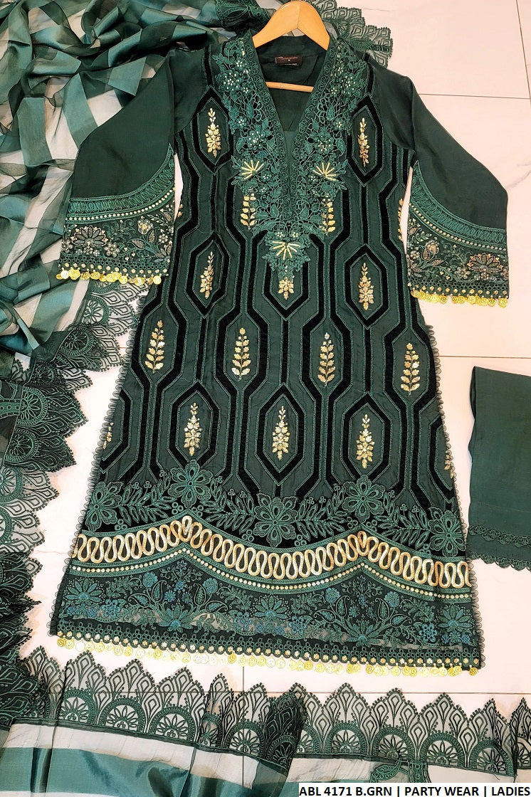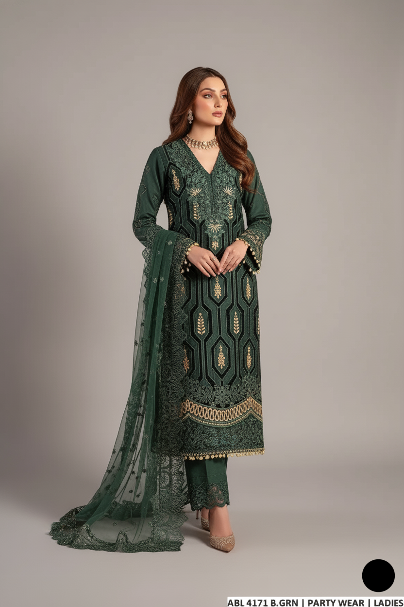 This graceful ensemble features an A-line shirt made from premium organza (length 46 inches), paired with grip-fabric trousers and a lightweight organza dupatta. Weighing just 0.960 kg, it’s perfect for elegant and festive occasions.