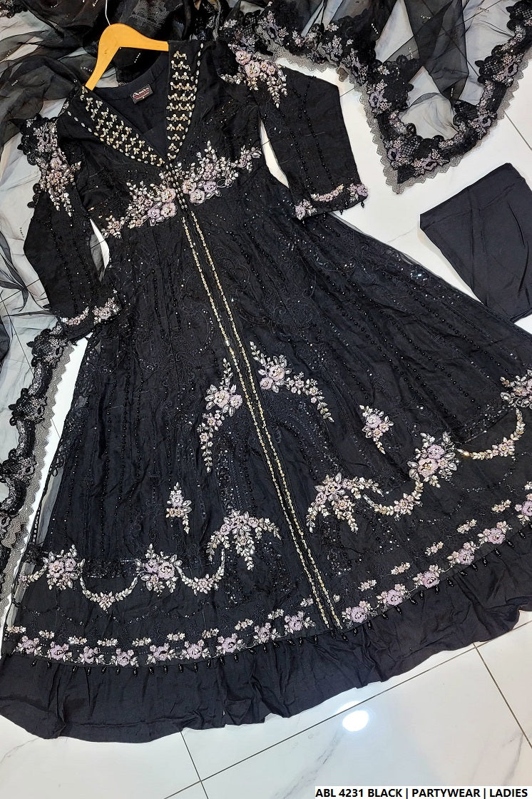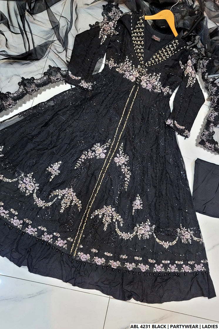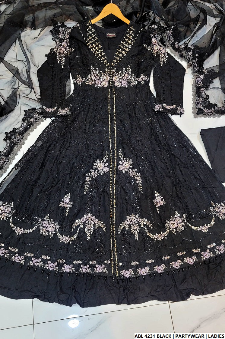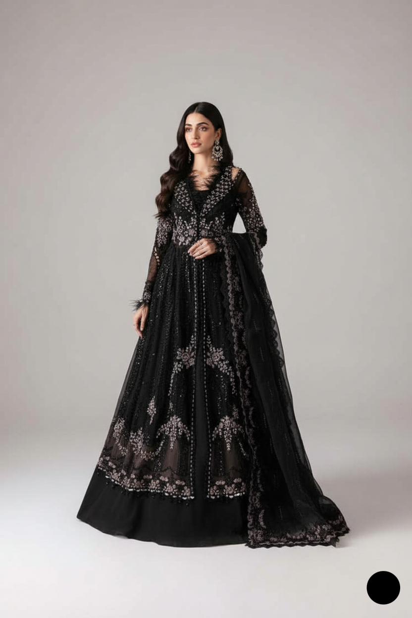 This luxurious ensemble features an open long frock made from premium organza, paired with soft and comfortable viscose trousers and a matching organza dupatta. With a shirt length of 56 to 58 inches, the outfit offers a majestic and flowing silhouette, perfect for formal events, receptions, or wedding functions. The outfit weighs 1.950 kg, giving it a substantial and graceful fall that elevates your entire look with a regal touch.