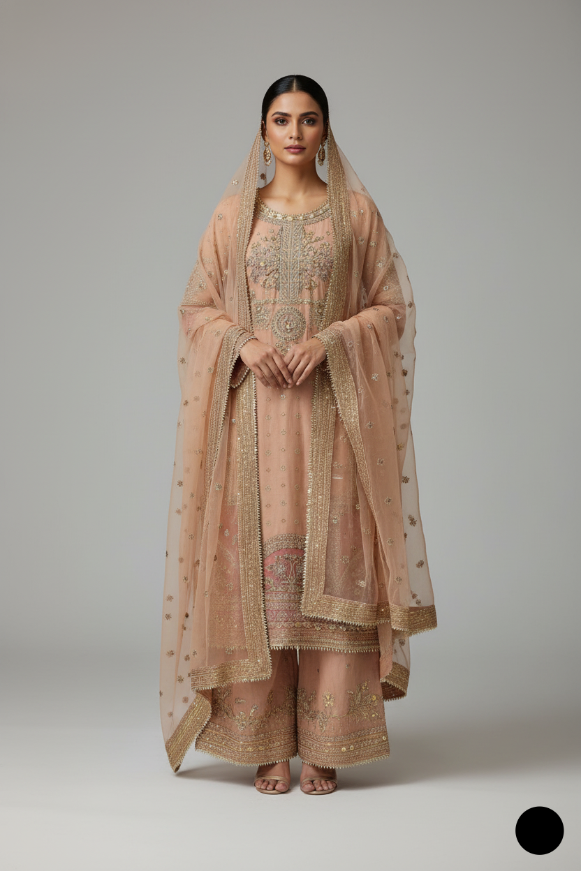 - The outfit features a shirt made from chiffon fabric, paired with trousers also crafted from chiffon fabric, and a dupatta made from organza fabric. The style of the ensemble is a straight shirt with plaazo trousers, offering a sleek and modern look. The shirt has a length of 44/46, providing a tailored and comfortable fit. The total weight of the outfit is 1.200 kg, making it lightweight yet elegant. The combination of soft, flowing chiffon and the delicate organza dupatta creates a perfect balance of sophistication and contemporary style, ideal for a chic and graceful appearance.