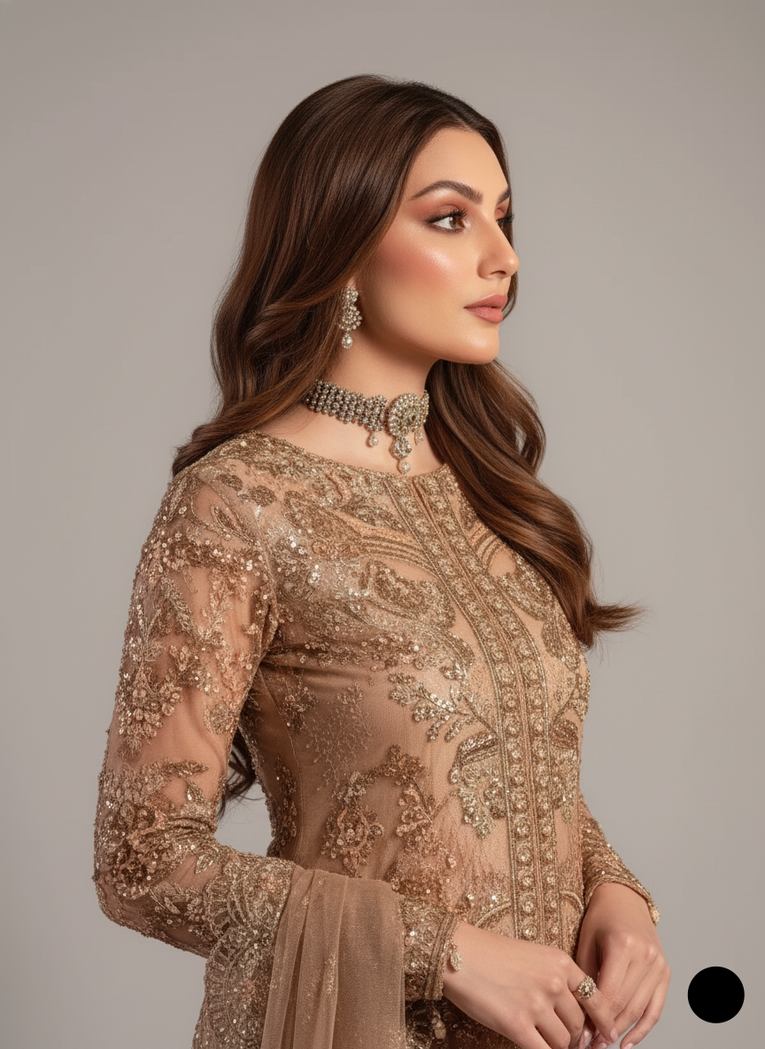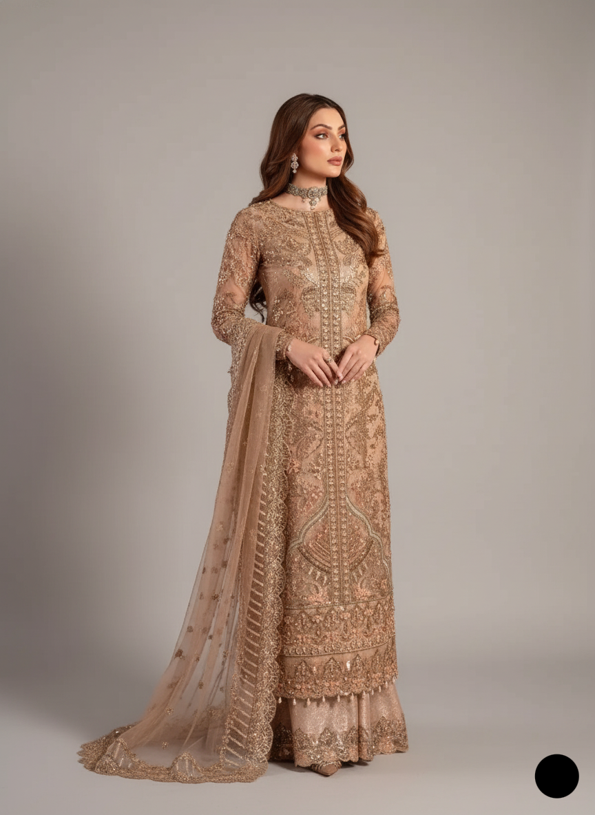 - This elegant outfit is crafted with delicate net fabric for the shirt, paired with comfortable masuri fabric for the trousers, offering a perfect blend of style and ease. The dupatta, made from luxurious organza, adds a graceful touch to the ensemble. Styled as a long shirt with sharara, it features a shirt length of 49 to 51 inches, creating a flowing, sophisticated silhouette. Weighing approximately 1.4 kg, this attire is ideal for both casual and formal occasions, exuding timeless charm and modern flair.