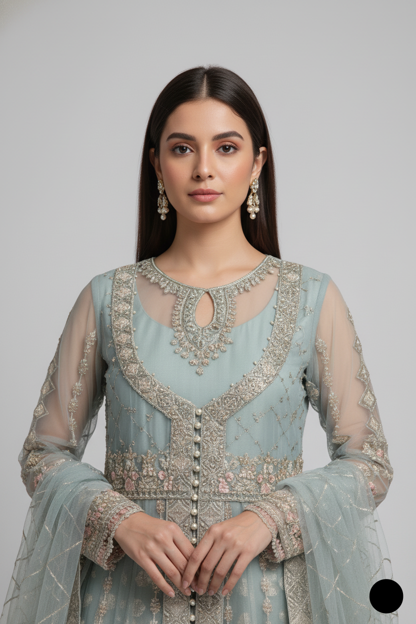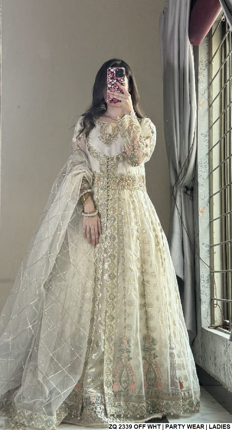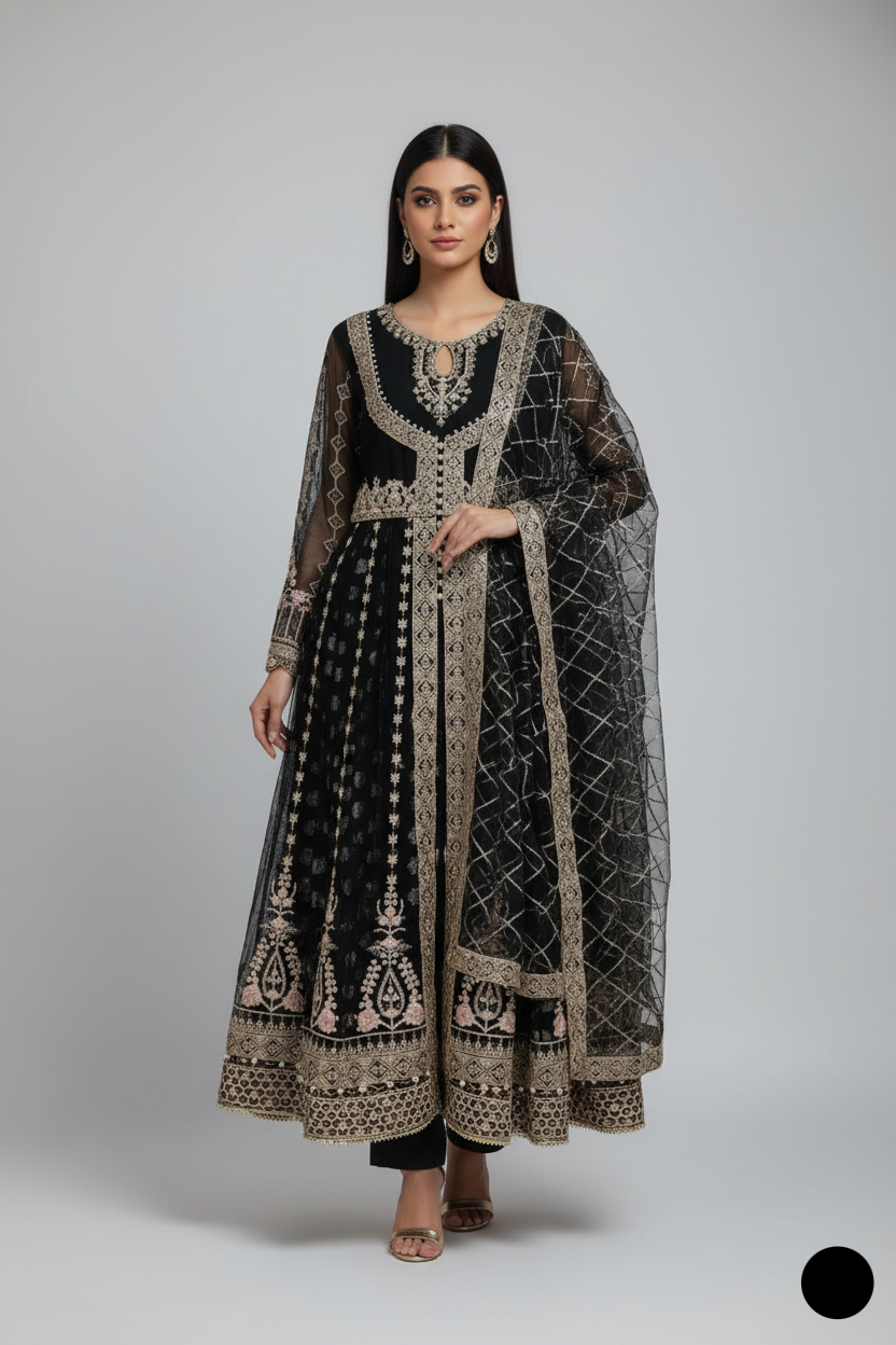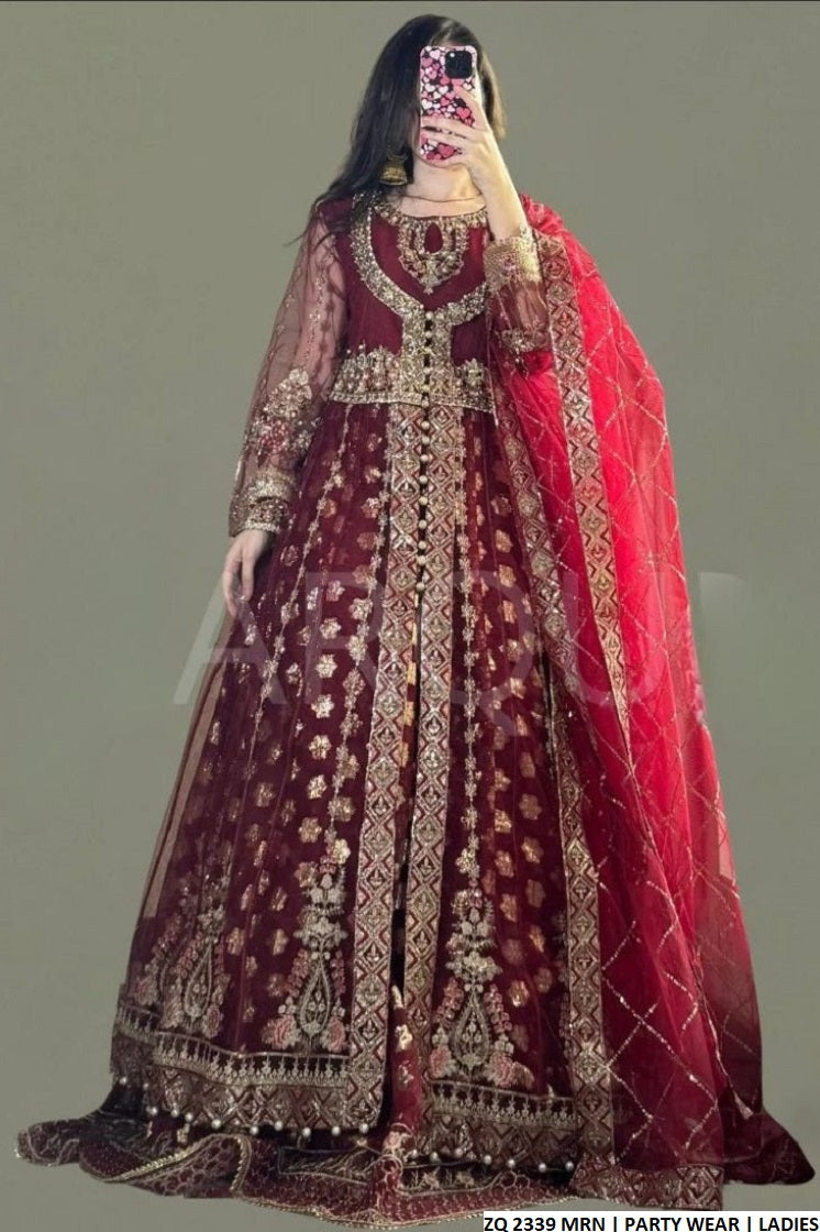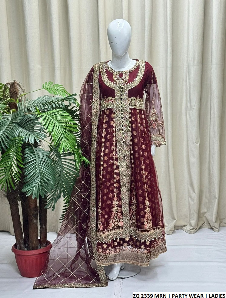 1. This stunning outfit features a net fabric shirt, paired with viscose trousers and a net dupatta. Designed in an open gown style maxi, the shirt length measures 50 to 52 inches. The total weight of the ensemble is 1.450 kg, offering an elegant and graceful look, perfect for any special occasion.