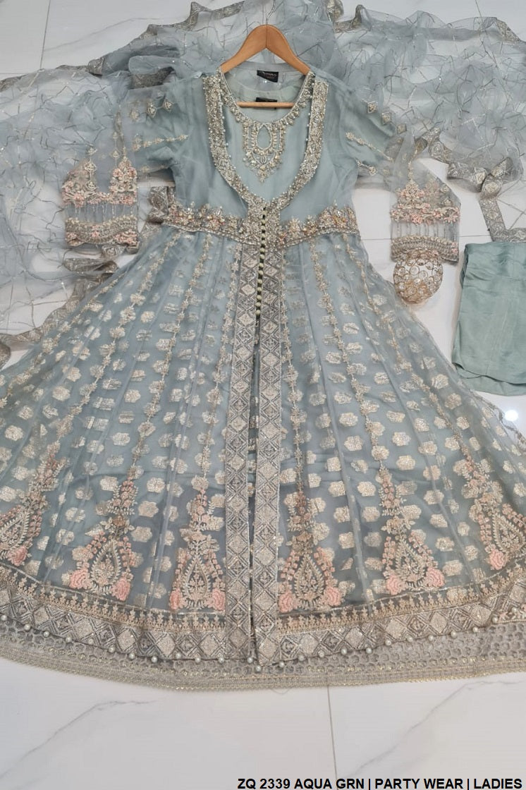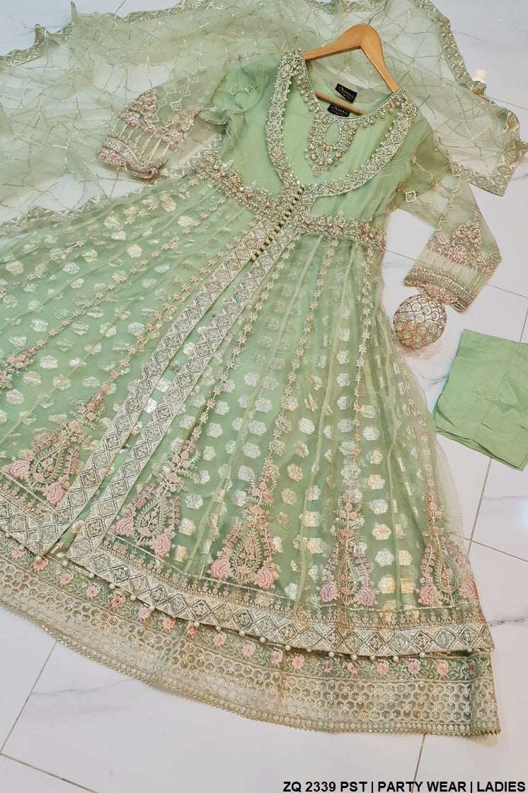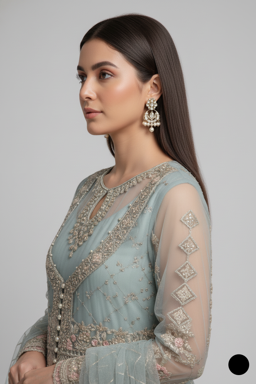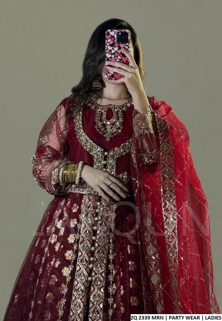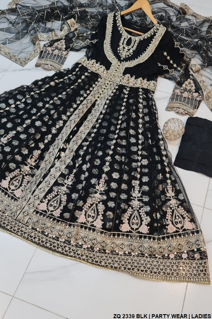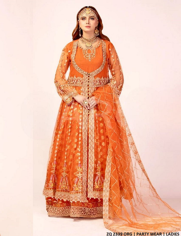 1. This stunning outfit features a net fabric shirt, paired with viscose trousers and a net dupatta. Designed in an open gown style maxi, the shirt length measures 50 to 52 inches. The total weight of the ensemble is 1.450 kg, offering an elegant and graceful look, perfect for any special occasion.