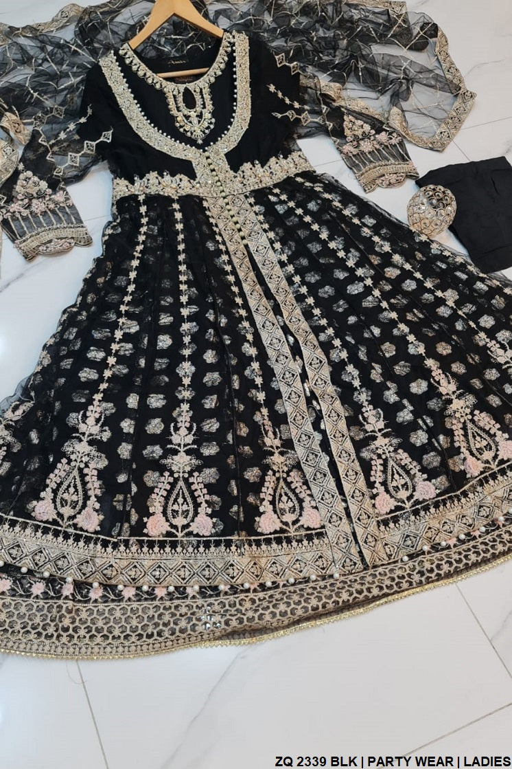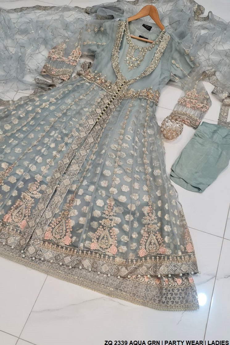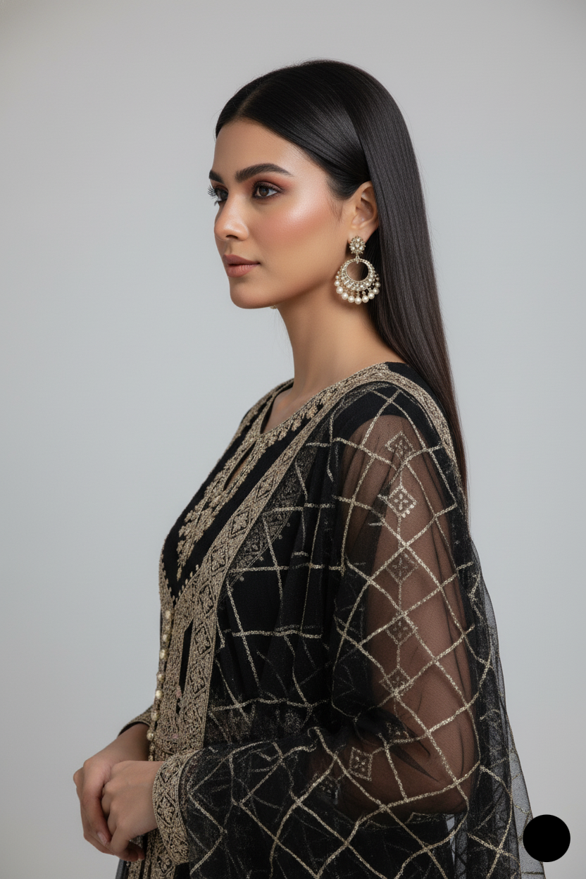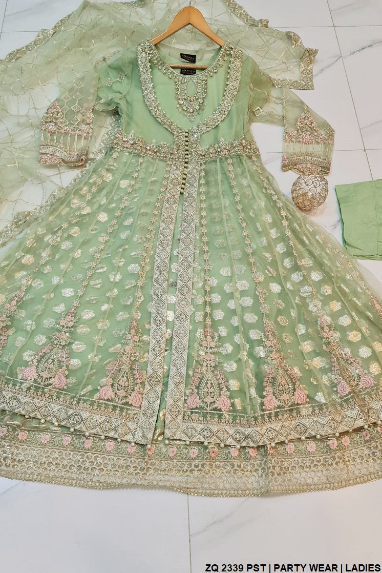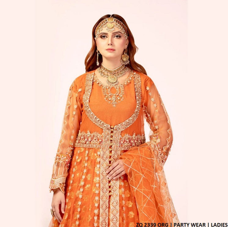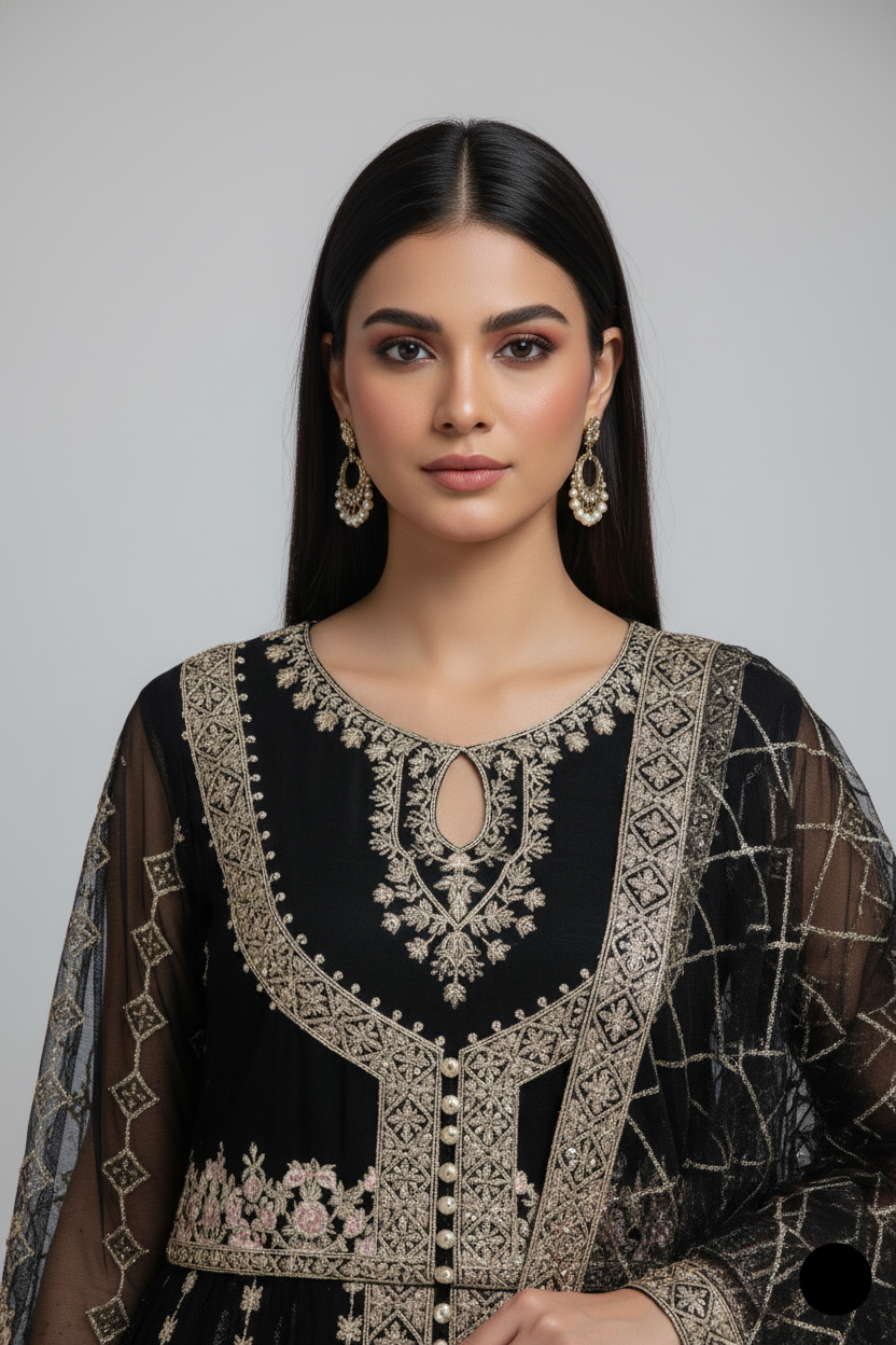 1. This stunning outfit features a net fabric shirt, paired with viscose trousers and a net dupatta. Designed in an open gown style maxi, the shirt length measures 50 to 52 inches. The total weight of the ensemble is 1.450 kg, offering an elegant and graceful look, perfect for any special occasion.
