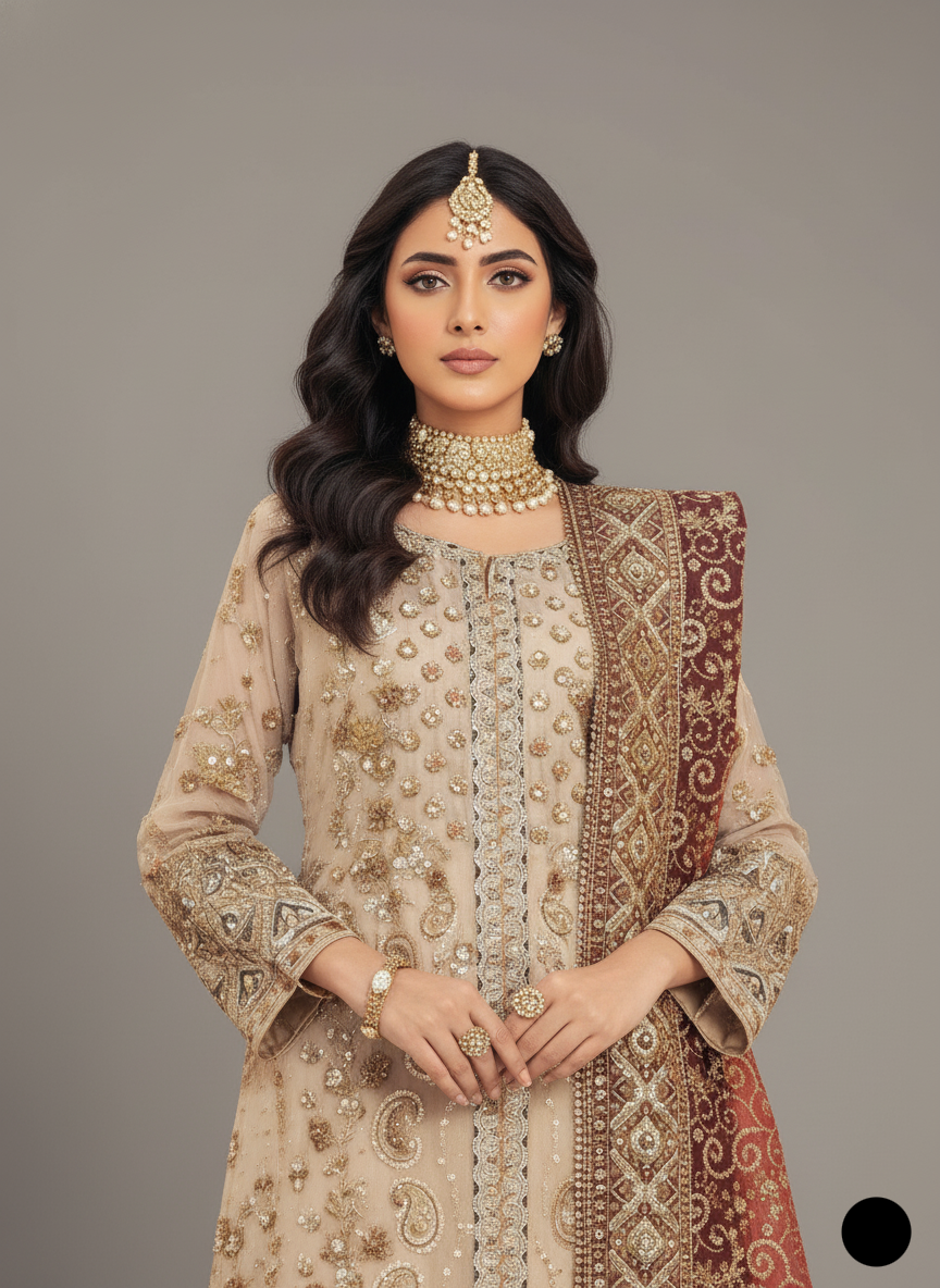 This elegant ensemble is a perfect balance of luxury and comfort, featuring a shirt made from high-quality Masuri Net fabric, paired effortlessly with Soft Net trousers. The look is elevated with a fully embroidered net dupatta, which adds a touch of intricate detail and refined sophistication. Styled as an Open Cut Shirt with Plazo, the silhouette is flattering and graceful, with the shirt length ranging from 40 to 42 inches. Weighing 1.950 kg, this outfit is ideal for formal events and festive celebrations, delivering a poised and stylish appearance.