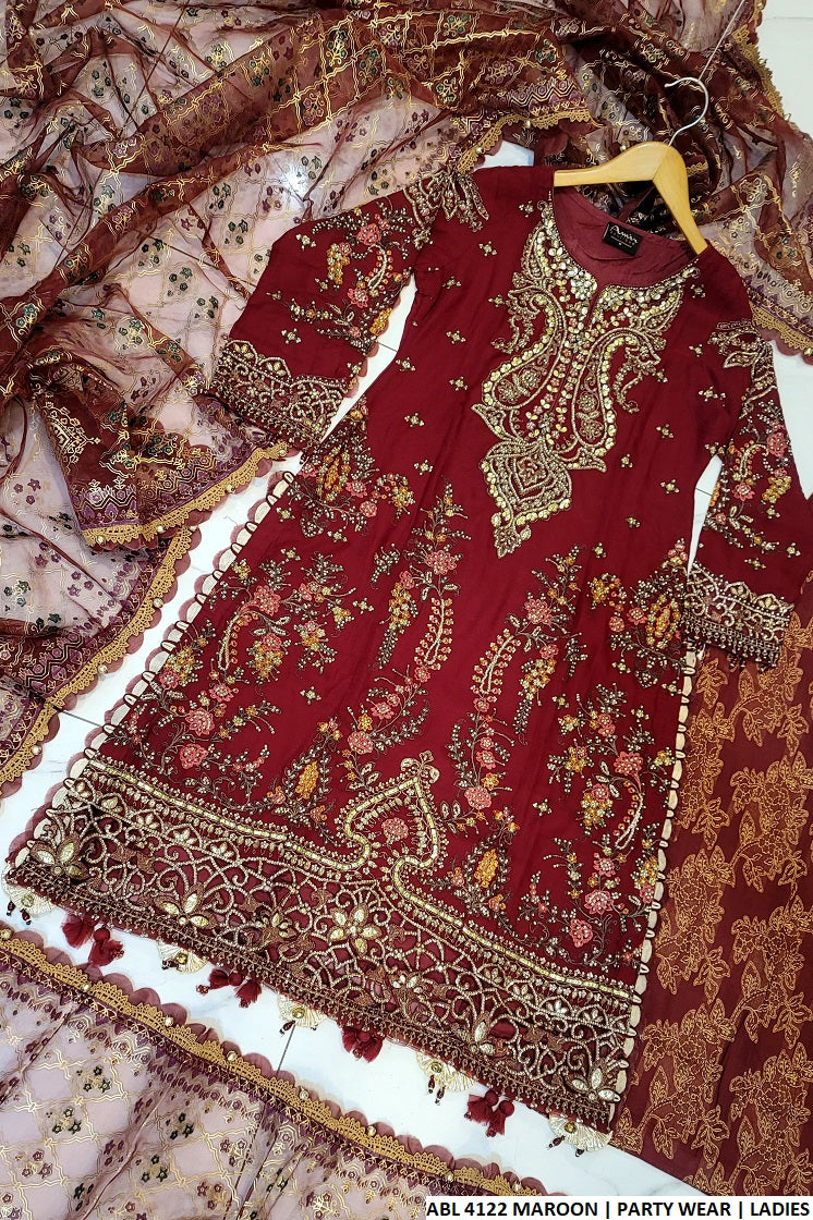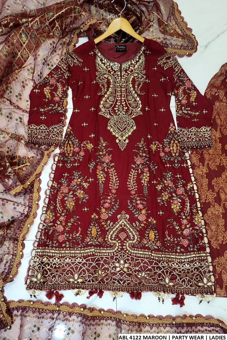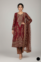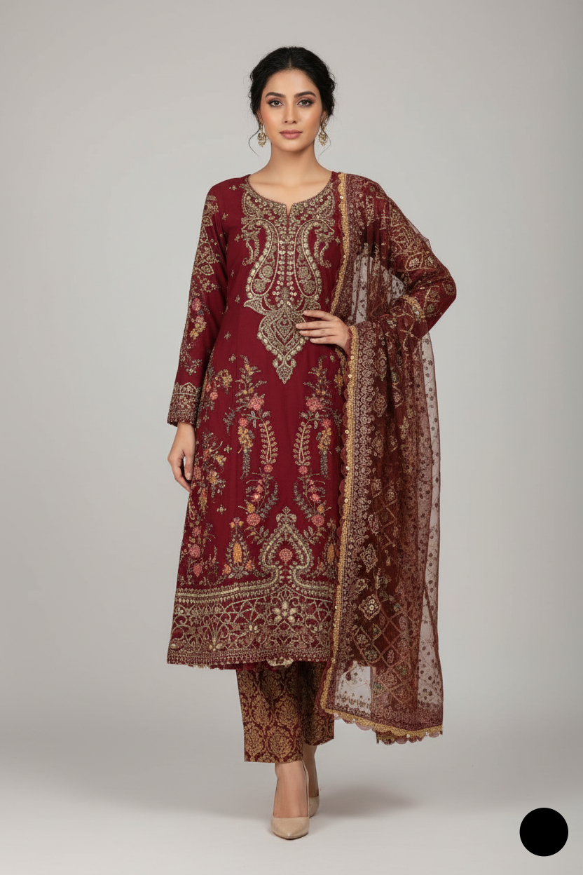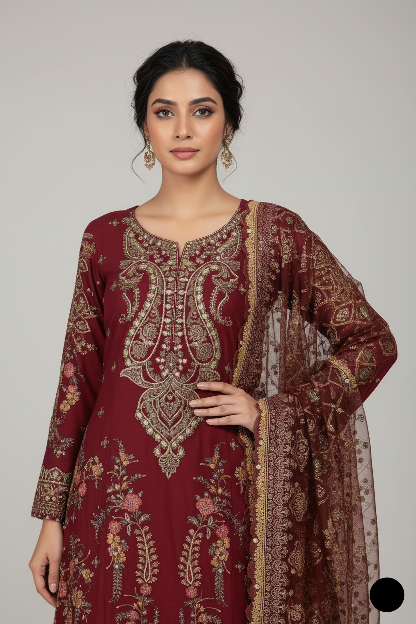 This refined ensemble effortlessly blends elegance with contemporary flair. The shirt is tailored from lightweight Chiffon fabric, offering a graceful drape and a comfortable fit. Paired with luxurious Jacquard trousers, the outfit provides texture and depth while maintaining a modern aesthetic. A delicate Organza dupatta adds a final touch of sophistication, bringing the look together beautifully. Designed in an A-Line Shirt with Plazo style, the silhouette is flattering and fluid, with a shirt length ranging from 43 to 45 inches. Weighing just 1.050 kg, this outfit is perfect for festive events, formal gatherings, or any occasion where elegance is a must.