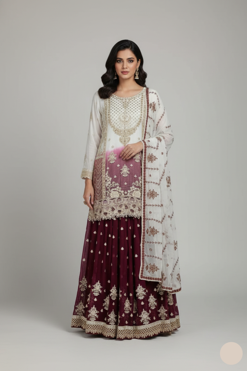 - This elegant ensemble features a short chiffon shirt paired with a matching chiffon gharara, creating a chic and sophisticated look. The shirt, with a length of 35 inches, offers a flattering fit, while the gharara adds a graceful, flowy touch. A coordinating chiffon dupatta completes the outfit, enhancing its overall appeal. Weighing just 0.95 kg, this lightweight yet stylish attire ensures both comfort and elegance, making it a perfect choice for festive and formal occasions.