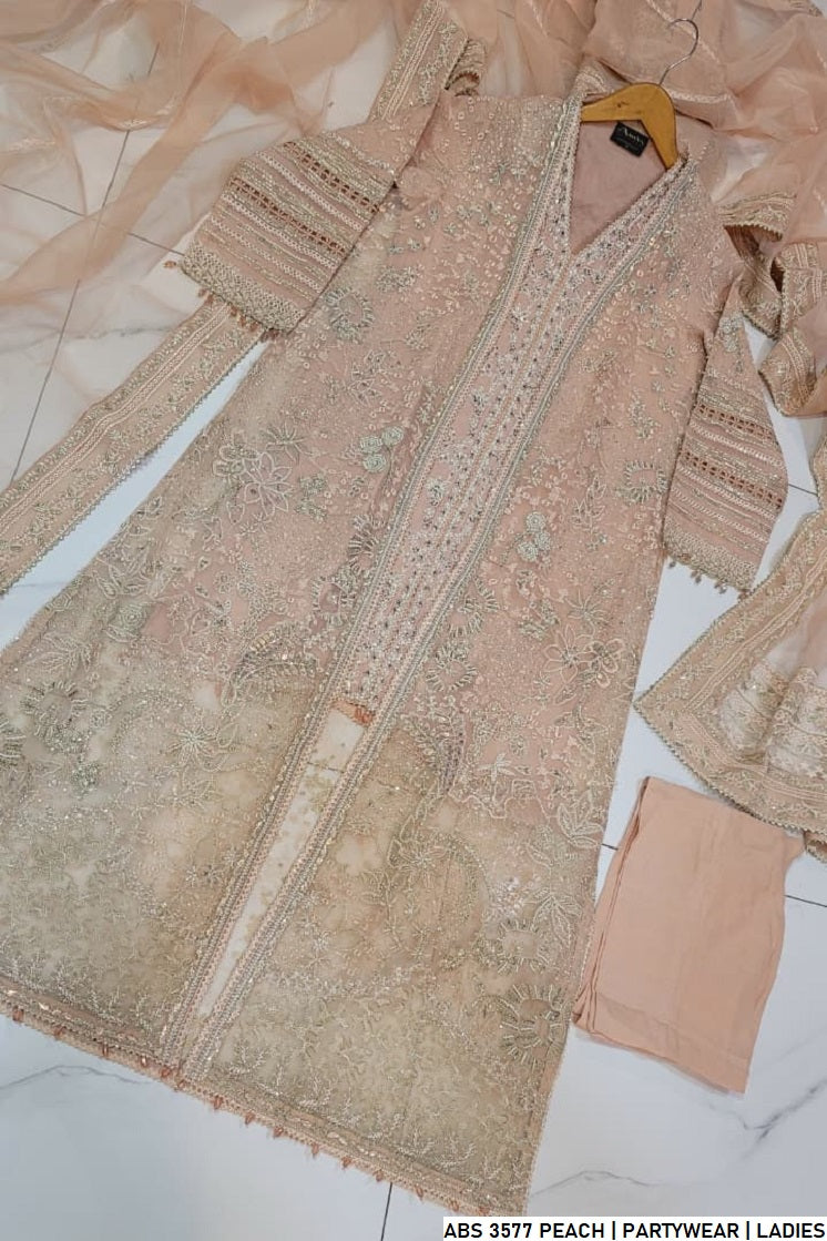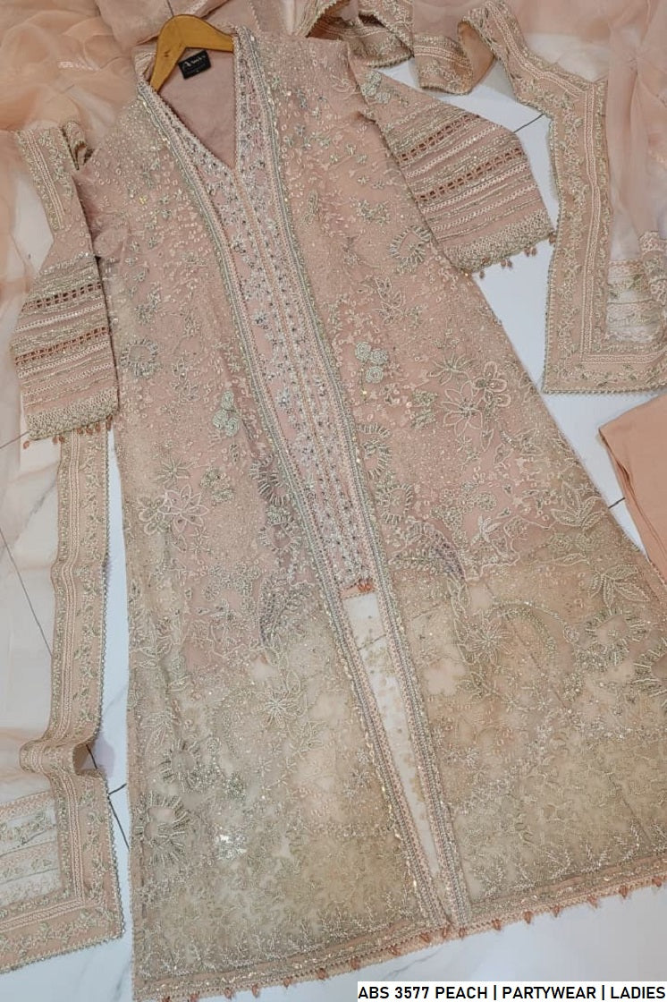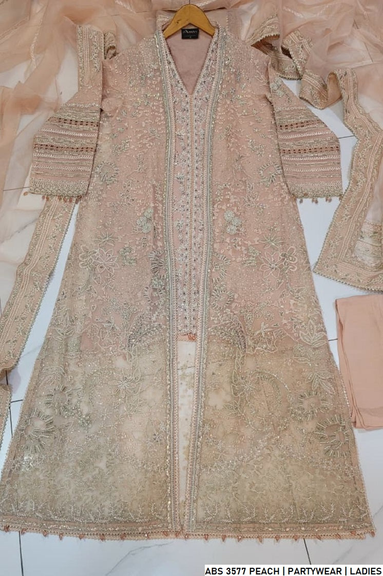 This stunning ensemble features an elegant open A-line shirt crafted from premium organza, paired with a sleek grip trouser and a matching organza dupatta. The shirt, with its flowing silhouette, measures between 54 to 56 inches in length, offering a graceful and dramatic flair perfect for formal occasions. With a total weight of 1.150 kg, this 3-piece outfit maintains a luxurious yet wearable feel. The organza fabric enhances the outfit's regal appeal, while the grip trousers provide a comfortable and polished finish to the look.
