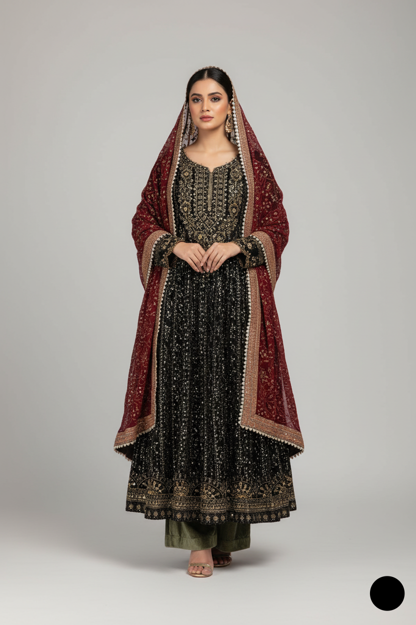 This elegant ensemble features a beautifully flowing Chiffon shirt designed in a graceful long frock style, perfect for formal occasions. Paired with a complementing Masuri trouser and a matching Chiffon dupatta, this outfit embodies sophistication and charm. With a shirt length of 48 to 50 inches, it offers a flattering silhouette, while the total weight of 1.500 kg ensures a comfortable yet luxurious wear.