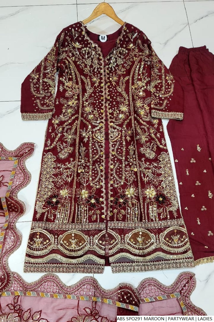 Make a bold and elegant statement with this stunning organza open long shirt, designed to give a graceful and modern look. It is paired with a sleek and comfortable grip trouser, offering a flattering silhouette. The ensemble is completed with a delicate organza dupatta that adds flow and finesse to the overall outfit. With a shirt length of 46/48 inches and a total weight of 1.050 kg, this piece is perfect for festive gatherings, formal events, or wedding functions where luxury and elegance are key.