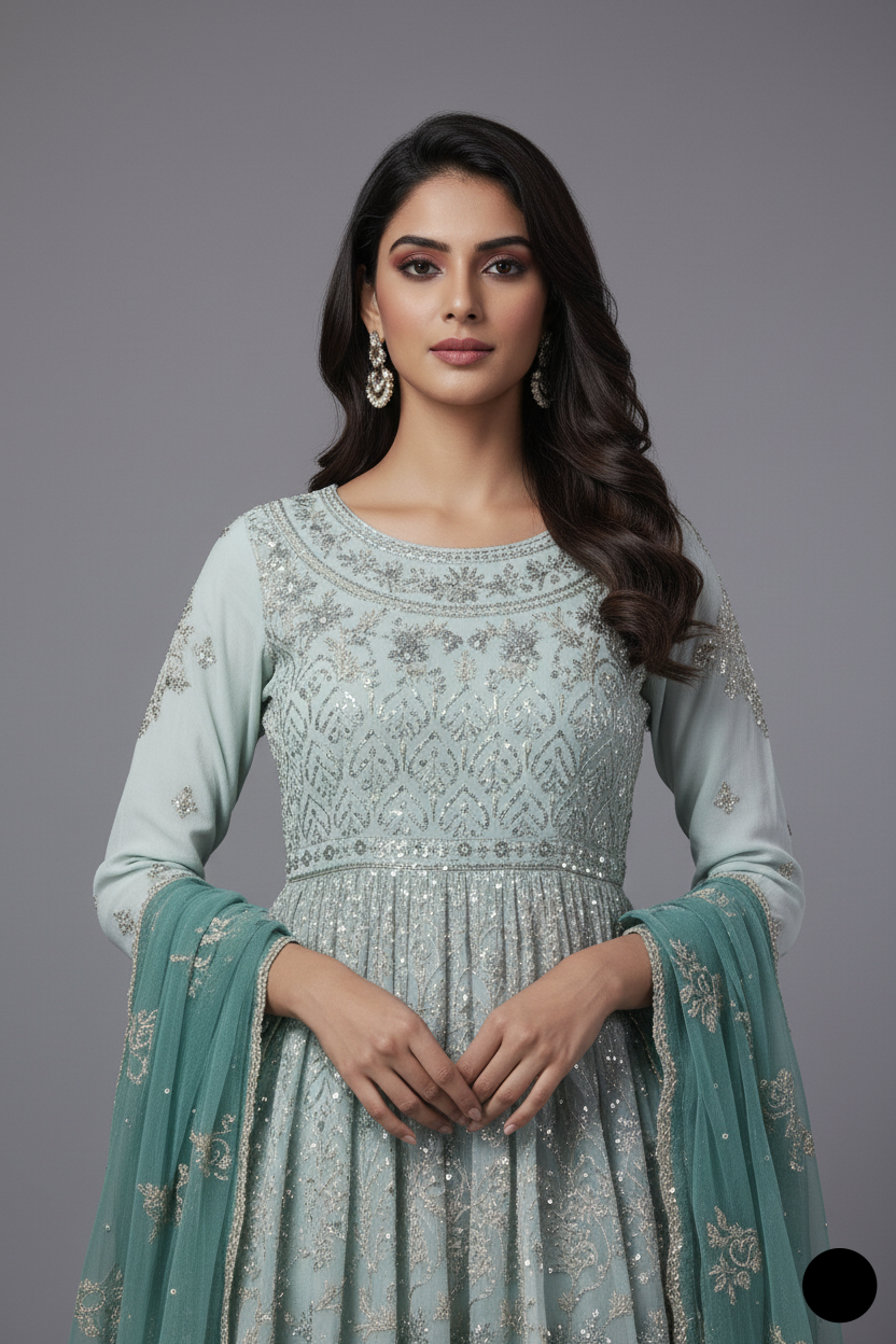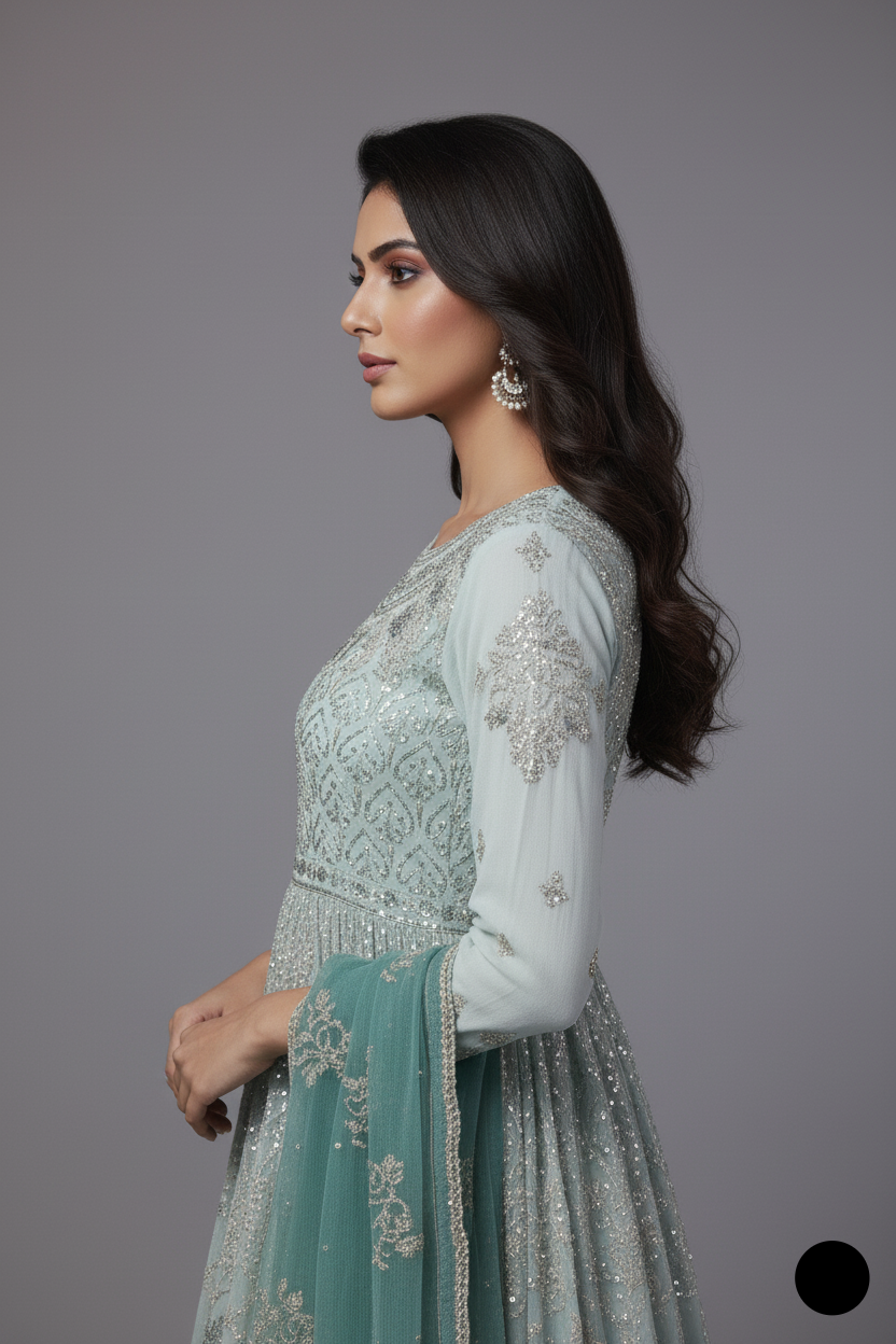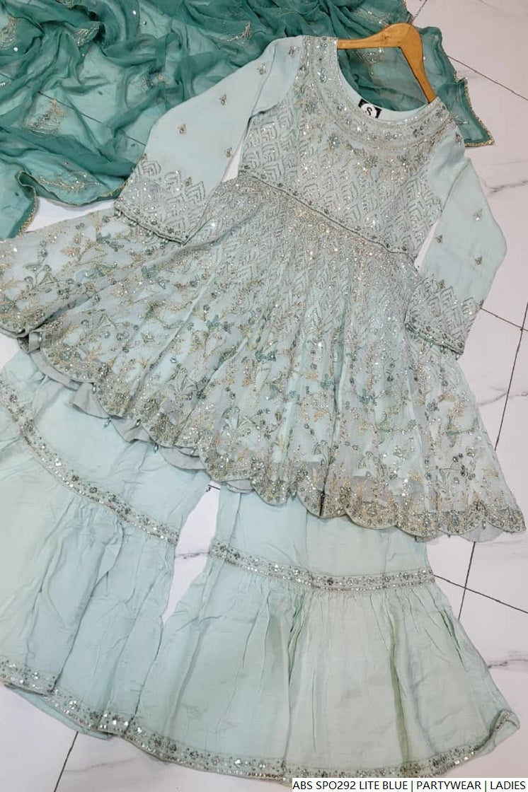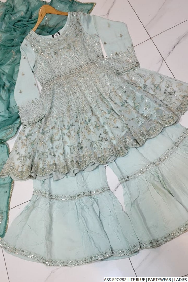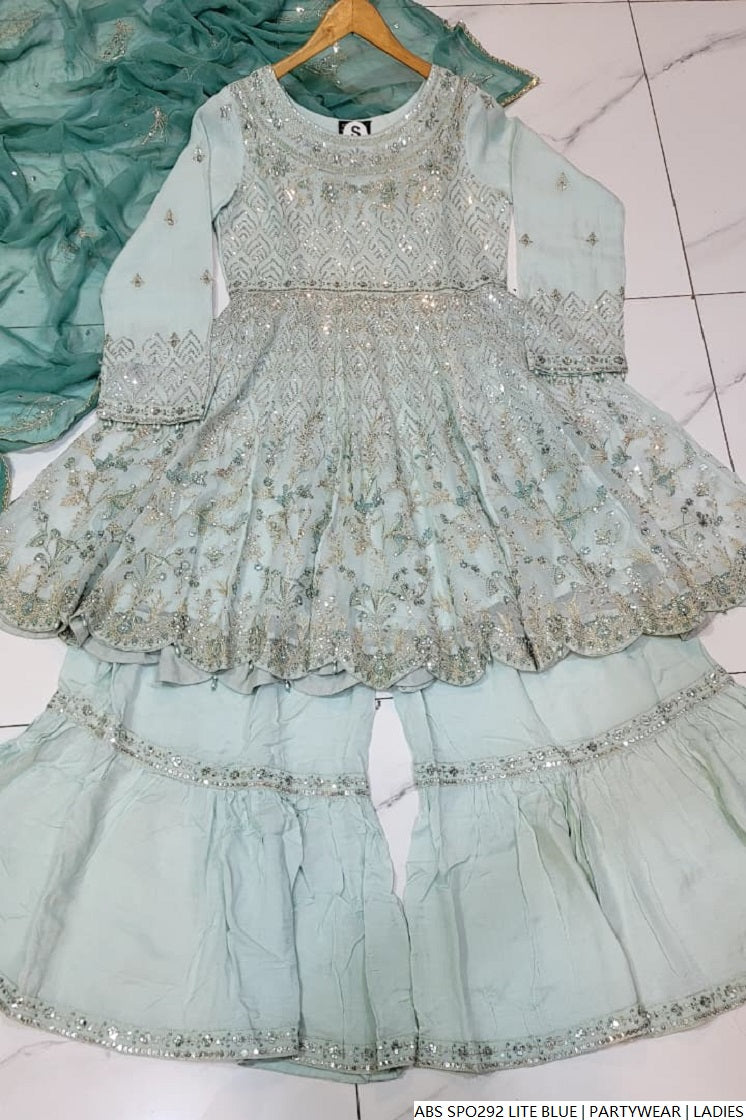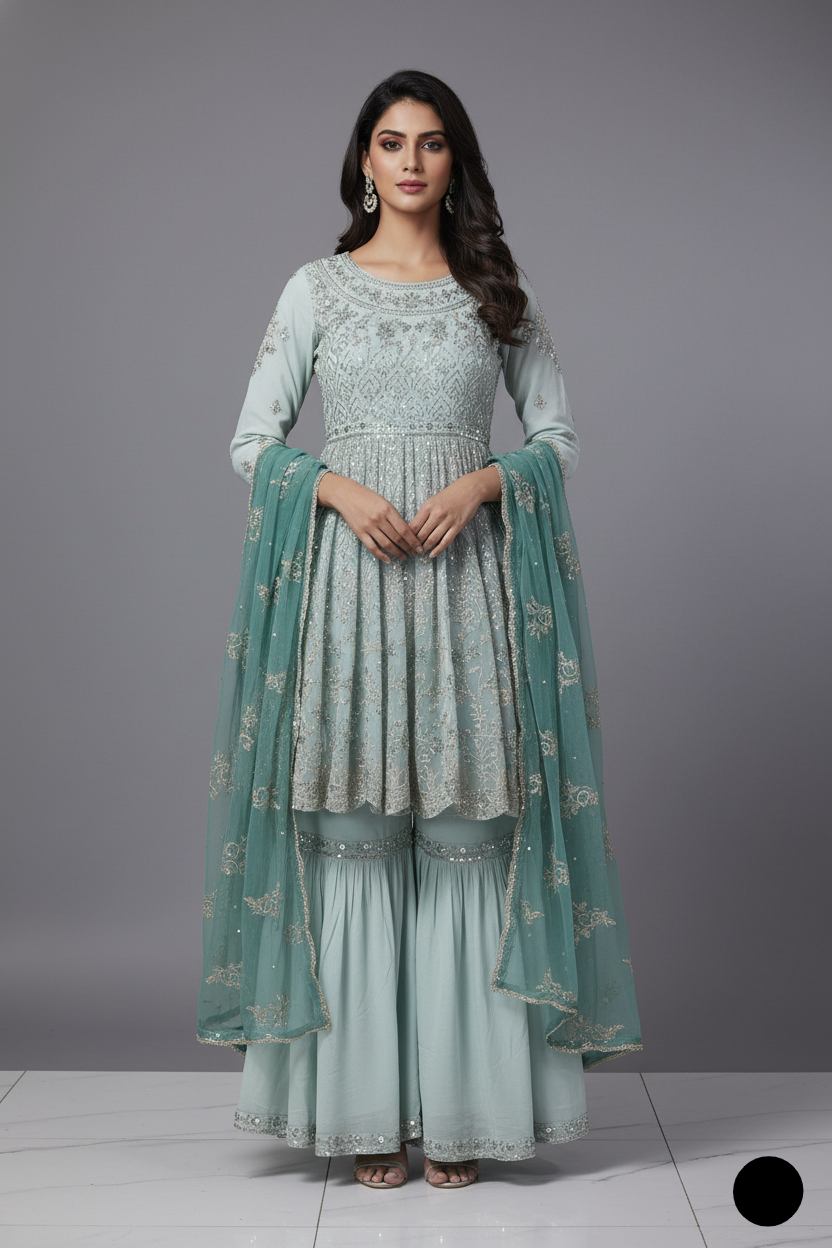 Step into timeless charm with this beautifully crafted chiffon short frock, paired with a traditional gharara made from grip fabric. The flowy chiffon dupatta adds grace and elegance to the complete look. With a shirt length of 38/40 inches and a manageable weight of 1.000 kg, this ensemble offers the perfect blend of cultural flair and modern style—ideal for festive events, mehndi functions, or formal gatherings.