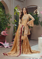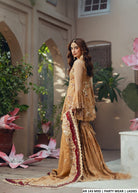 - This exquisite ensemble is crafted with luxurious zari chiffon fabric for both the shirt and dupatta, adding a touch of elegance and opulence. The lehnga is made from soft viscose, offering comfort and style. Designed in a short frock with gharara style, it perfectly blends tradition with a modern twist. The shirt length ranges from 33 to 35 inches, creating a chic and flattering silhouette. Weighing approximately 2.75 kg, this outfit is ideal for special events, exuding sophistication and timeless charm.