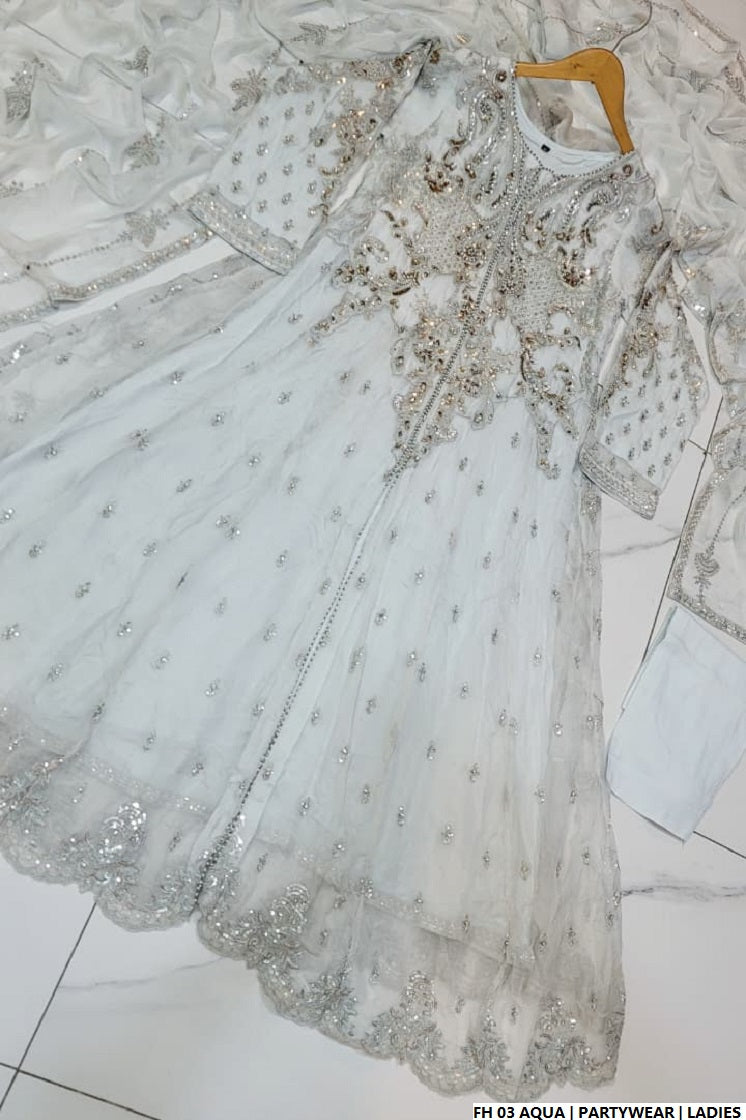 Elevate your formal wardrobe with this stunning 3-piece ensemble, designed with elegance in mind. The open long frock is made from flowing chiffon, offering a graceful and flattering silhouette with a shirt length of 51 to 53 inches. It is paired with comfortable grip fabric trousers and a matching chiffon dupatta to complete the look. Weighing approximately 1.200 kg, this outfit is perfect for festive events, parties, or formal gatherings, delivering both sophistication and style.