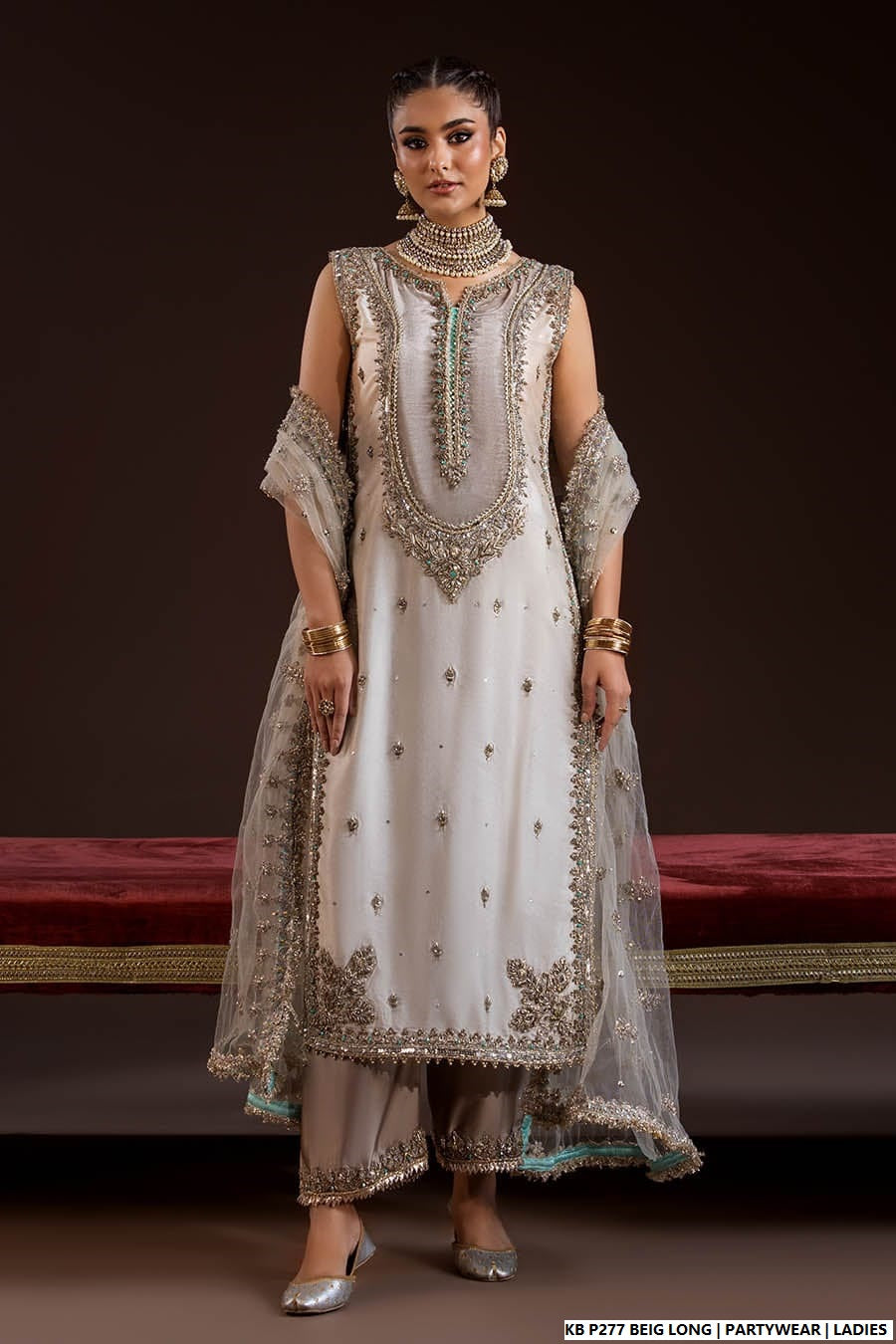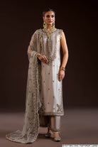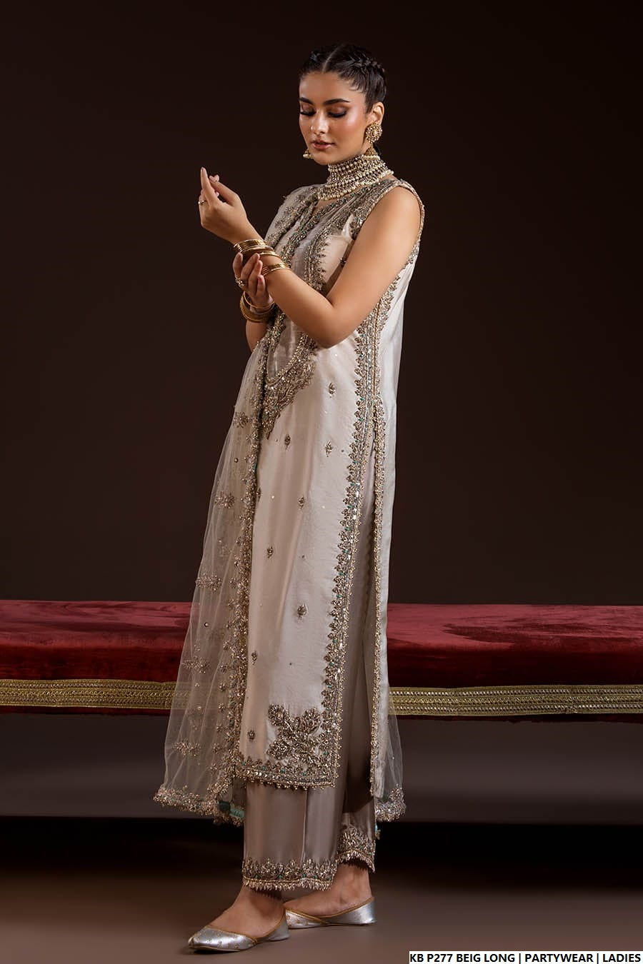 This elegant outfit is crafted with premium materials to create a luxurious and refined look. The long shirt is made from pure glass silk adorned with intricate kora dabka zardozi work, offering a graceful and traditional appeal. It is paired with pure charmeuse silk trousers that enhance comfort and elegance. The ensemble is completed with a delicate net dupatta, adding a soft and ethereal touch. With a shirt length of 40/42 and a total weight of 1.100 kg, this outfit is designed for beauty, comfort, and timeless sophistication.