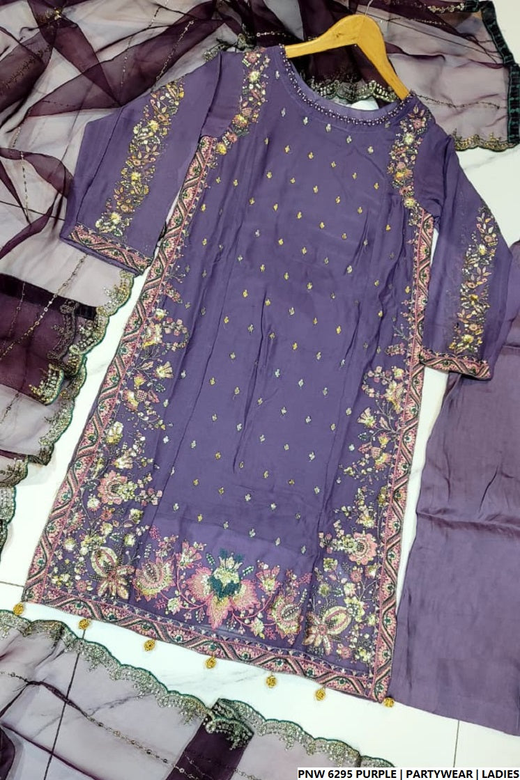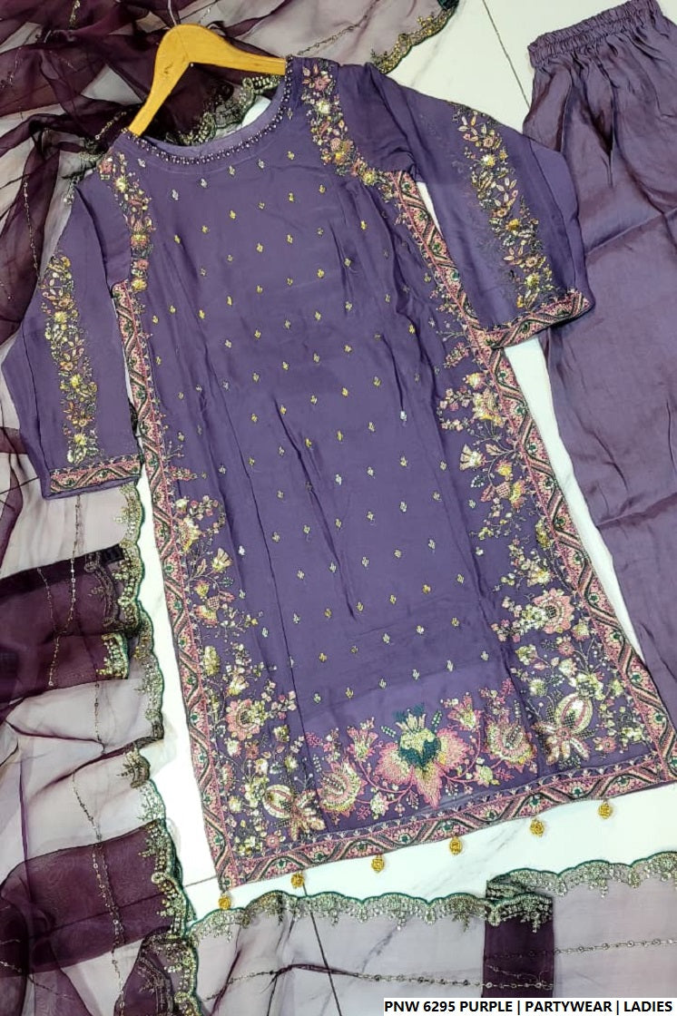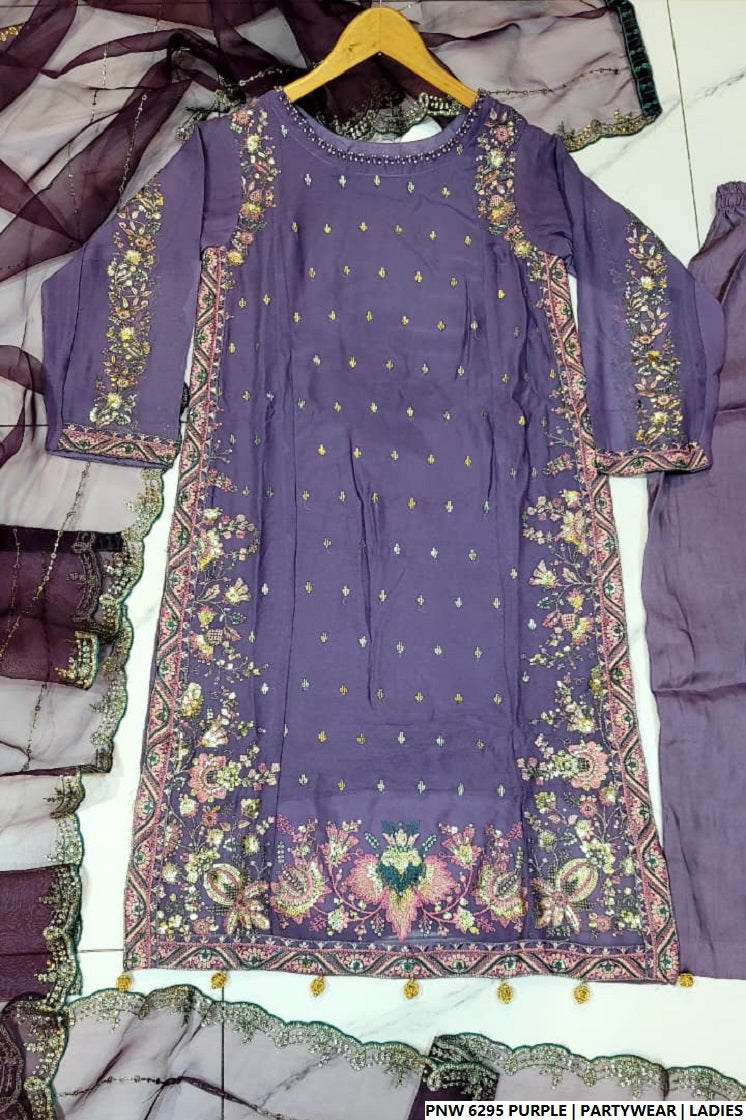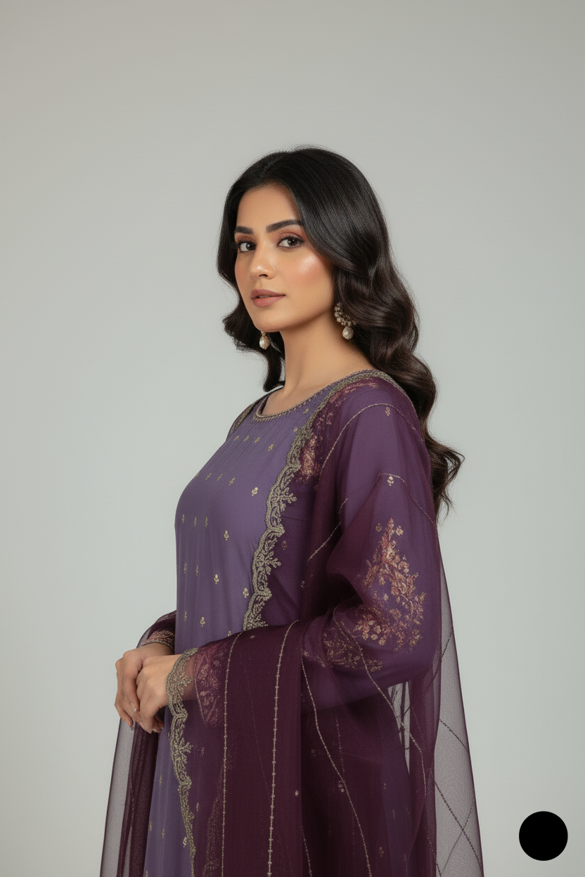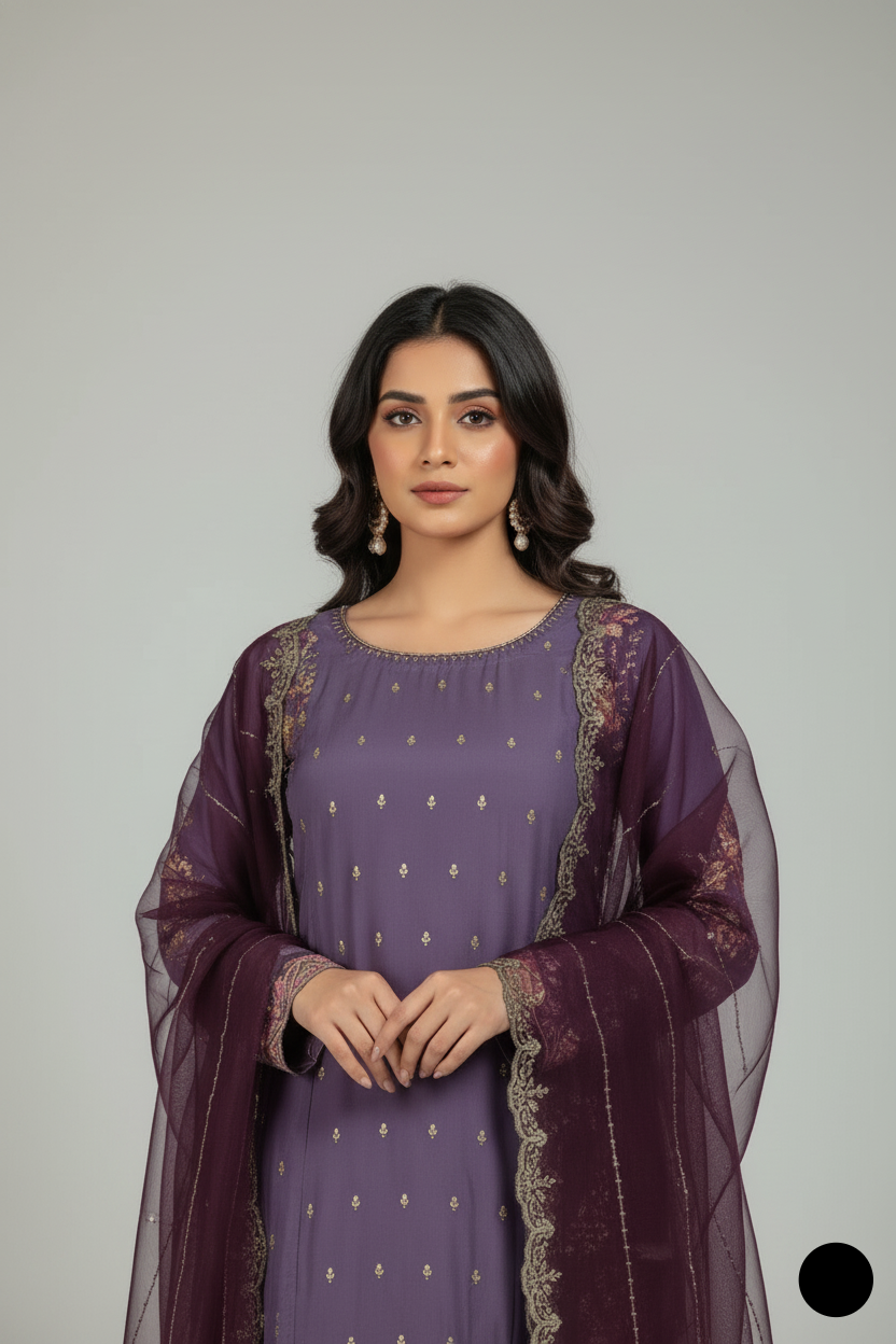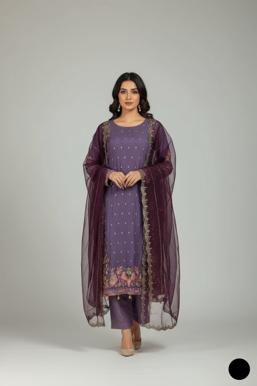 This elegant outfit features a straight shirt made from chiffon, offering a soft and breathable texture for all-day comfort. Paired with grip fabric trousers, it ensures a structured yet stylish fit. The look is completed with a delicate organza dupatta that adds a graceful touch to the ensemble. With a shirt length ranging from 38 to 40 inches and a total weight of only 0.550 kg, this outfit is lightweight and versatile—ideal for both casual gatherings and semi-formal occasions.