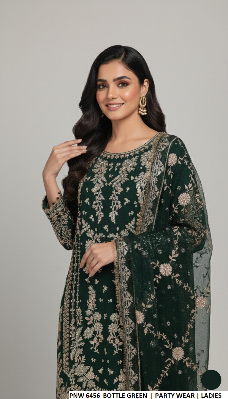 This classic straight shirt outfit is designed with lightweight chiffon fabric that offers a soft, elegant drape. The shirt is paired with comfortable viscose trousers, ensuring all-day ease and wearability. A matching chiffon dupatta enhances the overall look with a graceful finish. With a shirt length of 39 to 41 inches and a lightweight feel of 0.900 kg, this ensemble is perfect for casual gatherings, formal wear, or everyday elegance.
