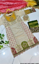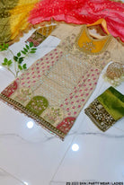This elegant outfit features a shirt made from Masuri net fabric, offering a light and airy feel. The trouser is crafted from Jamawar fabric, adding a touch of sophistication with its rich texture. The dupatta, made from Organza, beautifully complements the ensemble with its sheer and delicate appearance. The shirt has a length of 40/42 inches, providing a flattering fit. The total weight of the outfit is 0.800 kg, ensuring both comfort and style.