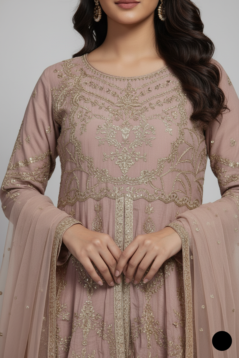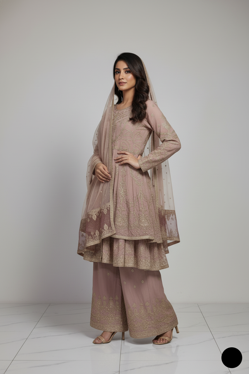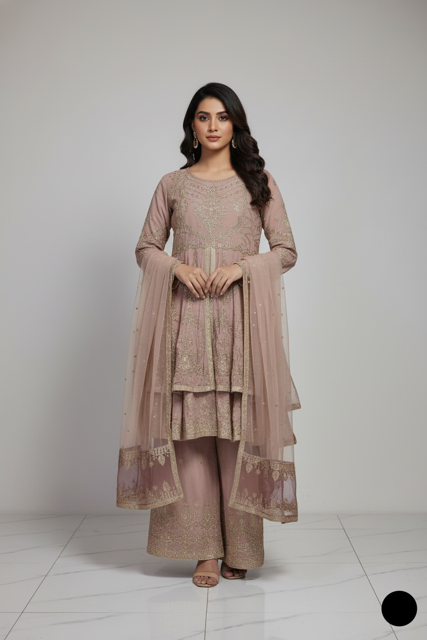 Step into refined elegance with this Ready to Wear outfit featuring a charming short frock-style shirt made from soft, flowing Chiffon, paired with a contemporary Grip palazzo for comfort and flair. The look is elevated with a delicate Organza dupatta, adding a hint of sophistication and femininity. With a shirt length of 38 to 40 inches and a total weight of 1.150 KG, this ensemble is lightweight yet statement-making—perfect for festive events, semi-formal gatherings, or seasonal celebrations.