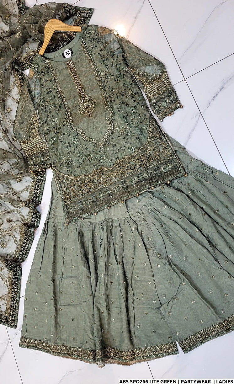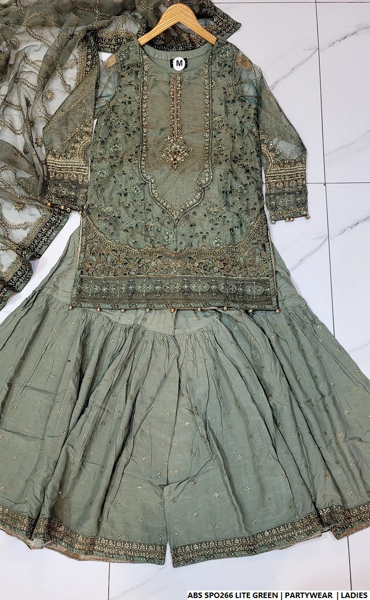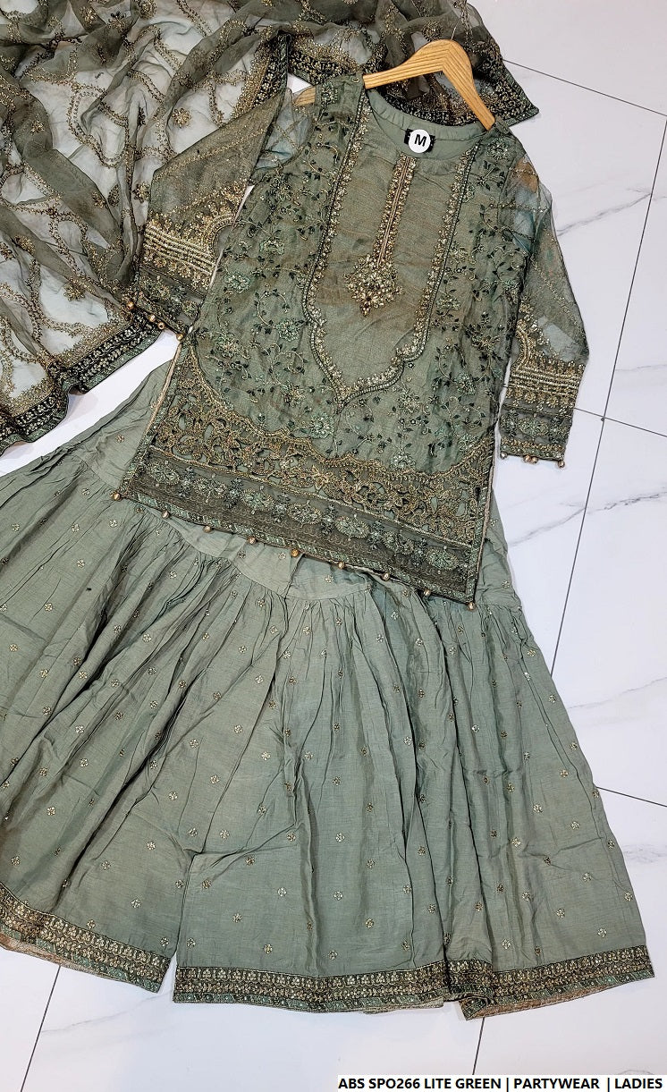This elegant ensemble features a short shirt made from delicate Mauri net, designed with a graceful shirt length of 31 to 33 inches for a trendy, festive appeal. The outfit is paired with a beautifully flared grip fabric gharara that adds traditional charm with a touch of contemporary comfort. Completing the look is an organza dupatta that brings in an element of lightness and subtle luxury. Weighing 1.250 kg, this outfit is ideal for weddings, mehndi functions, or festive occasions where tradition meets modern fashion.