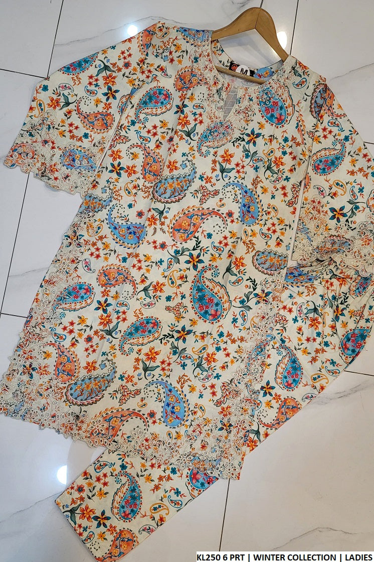 1. This stylish outfit is crafted from premium winter cotton, making it ideal for cooler weather. The ensemble features a straight shirt with a length of 39/41 inches, providing a comfortable and flattering fit. Paired with matching trousers made from the same winter cotton fabric, the look is both cozy and chic. A dupatta made from 2PC fabric adds an elegant touch to complete the outfit. Weighing just 0.550 kg, this lightweight yet warm ensemble is perfect for staying fashionable and comfortable during the colder months.