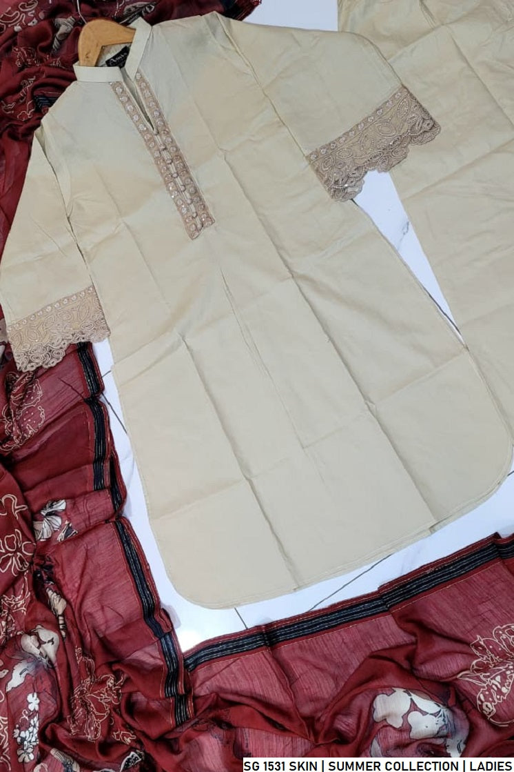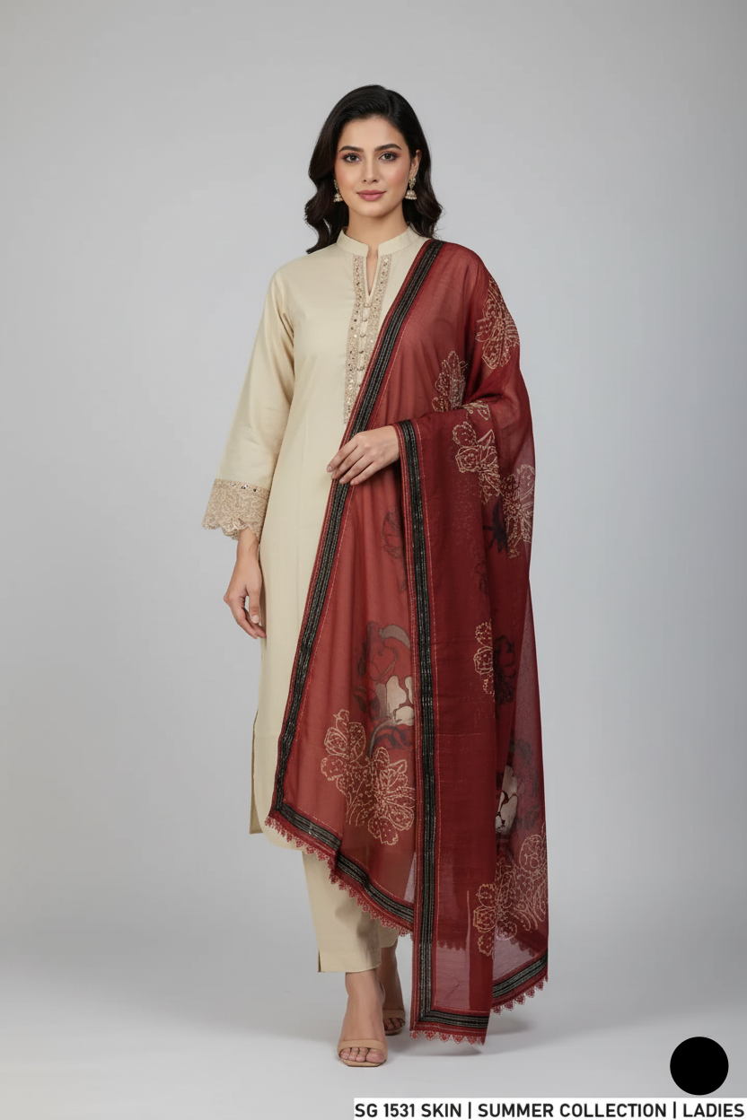 This stylish three-piece suit features a cotton Goal Daman shirt designed in a flattering silhouette with a shirt length ranging from 41 to 43 inches. The set includes matching cotton trousers for everyday comfort and a digitally printed dupatta that adds a modern, vibrant touch to the overall look. With a total weight of just 0.450 kg, this lightweight outfit is ideal for daily wear or casual outings, offering both elegance and ease.