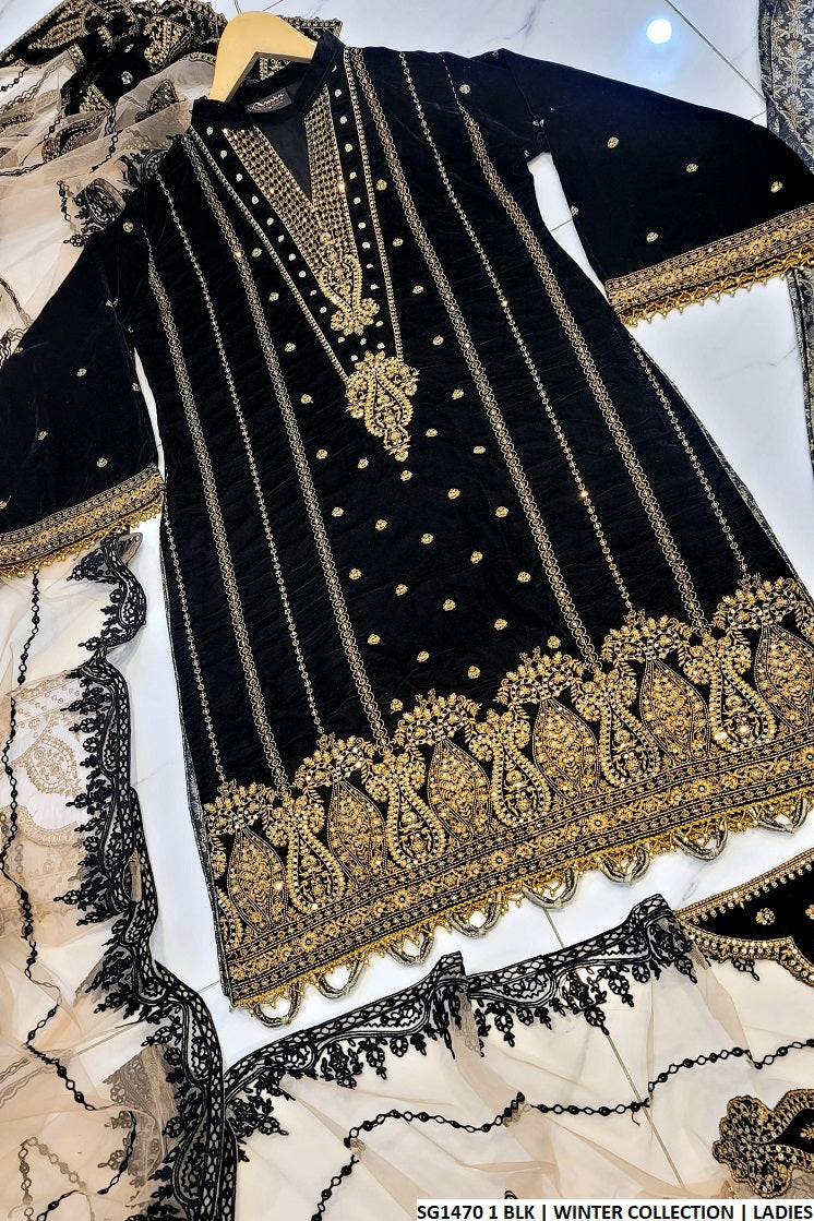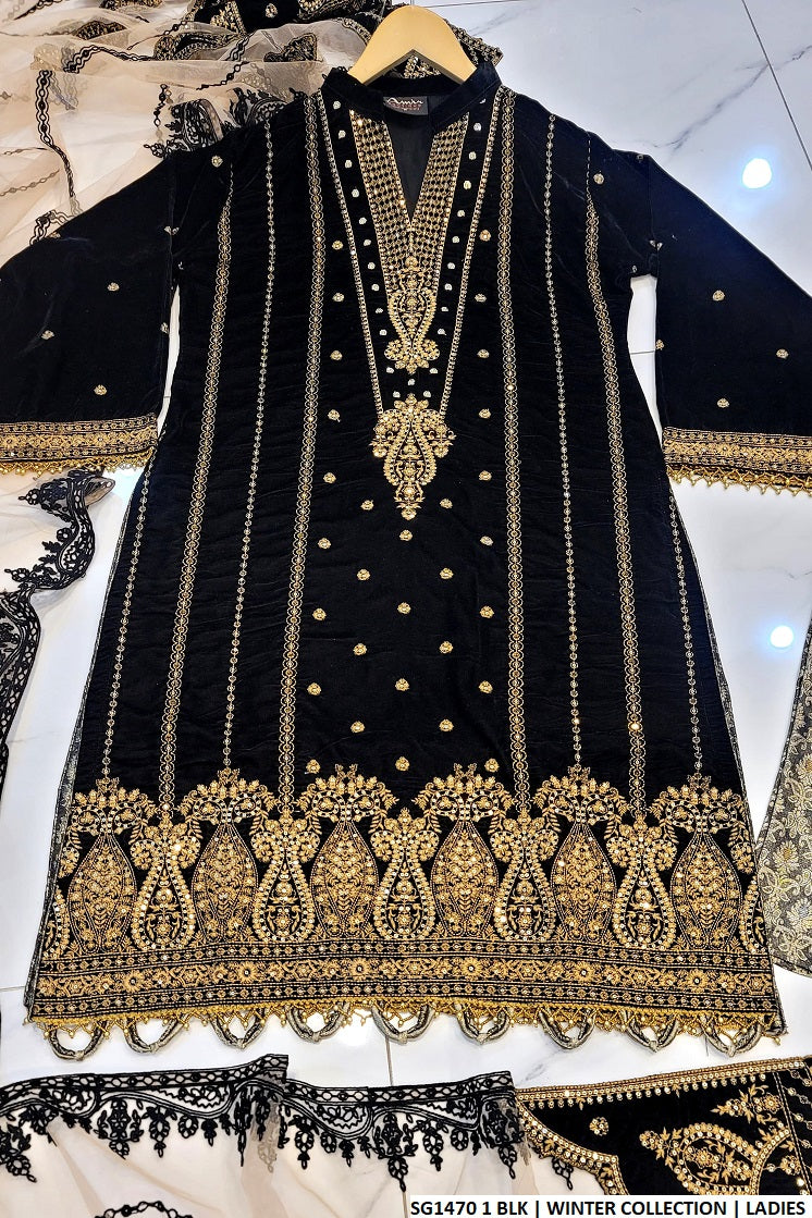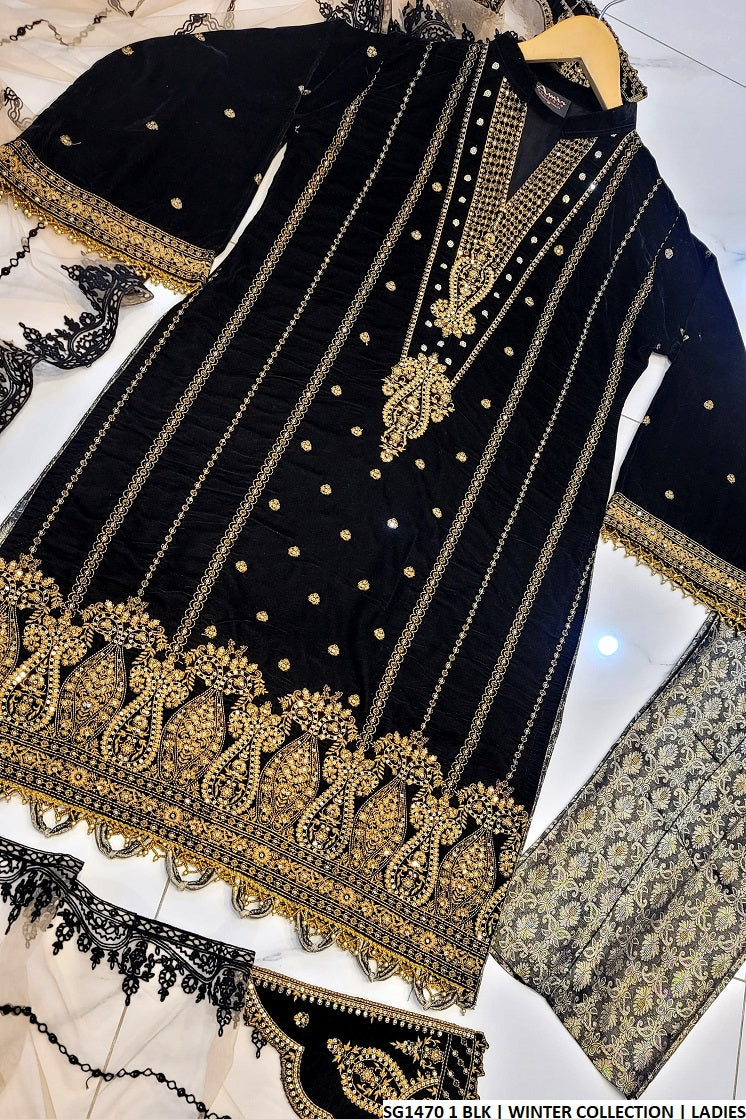 - The shirt is made from luxurious velvet fabric, complemented by jamawar fabric for the trousers. The dupatta is crafted from delicate net fabric, and the style features a straight-cut shirt. The shirt comes in lengths of 40/42 and weighs 0.800 kg, offering both elegance and comfort.